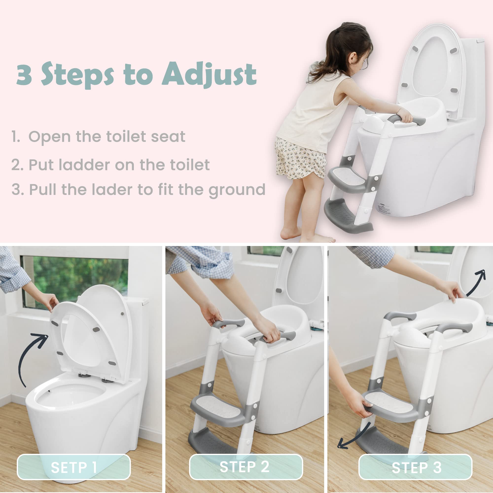 【STABLE & ANTI-SLIP】 - The mat made of TPE material of our potty training toilet with step stool can effectively prevent children from shaking or slipping when they turn around and sit down. The 4 rubber strips attached to the first floor pedal are firmly attached to the ground to prevent movement.