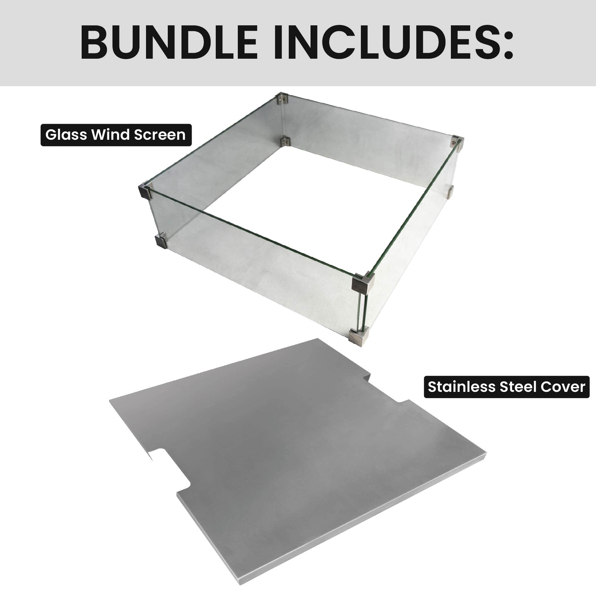 What’s Included: Each firepit accessory bundle includes the tempered glass windscreen with stainless steel attachments and a stainless-steel cover. This glass wind screen and stainless-steel cover are custom fits for both the natural gas and propane versions of the Manhattan Fire Pit, keeping your firepit protected and loved ones safe.