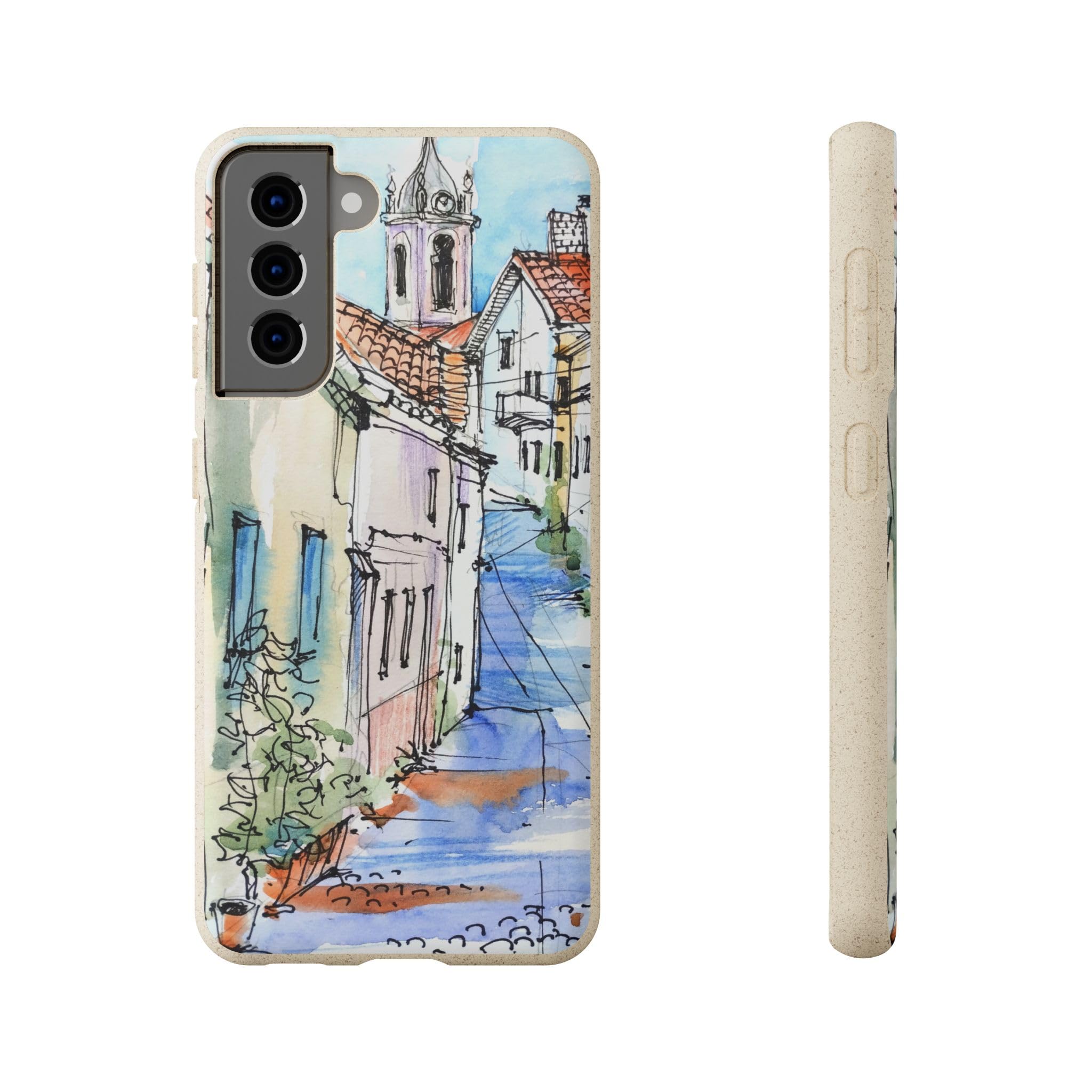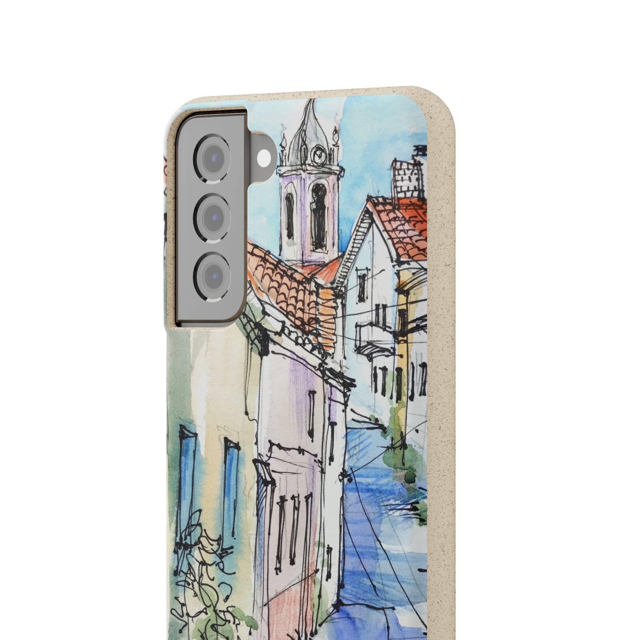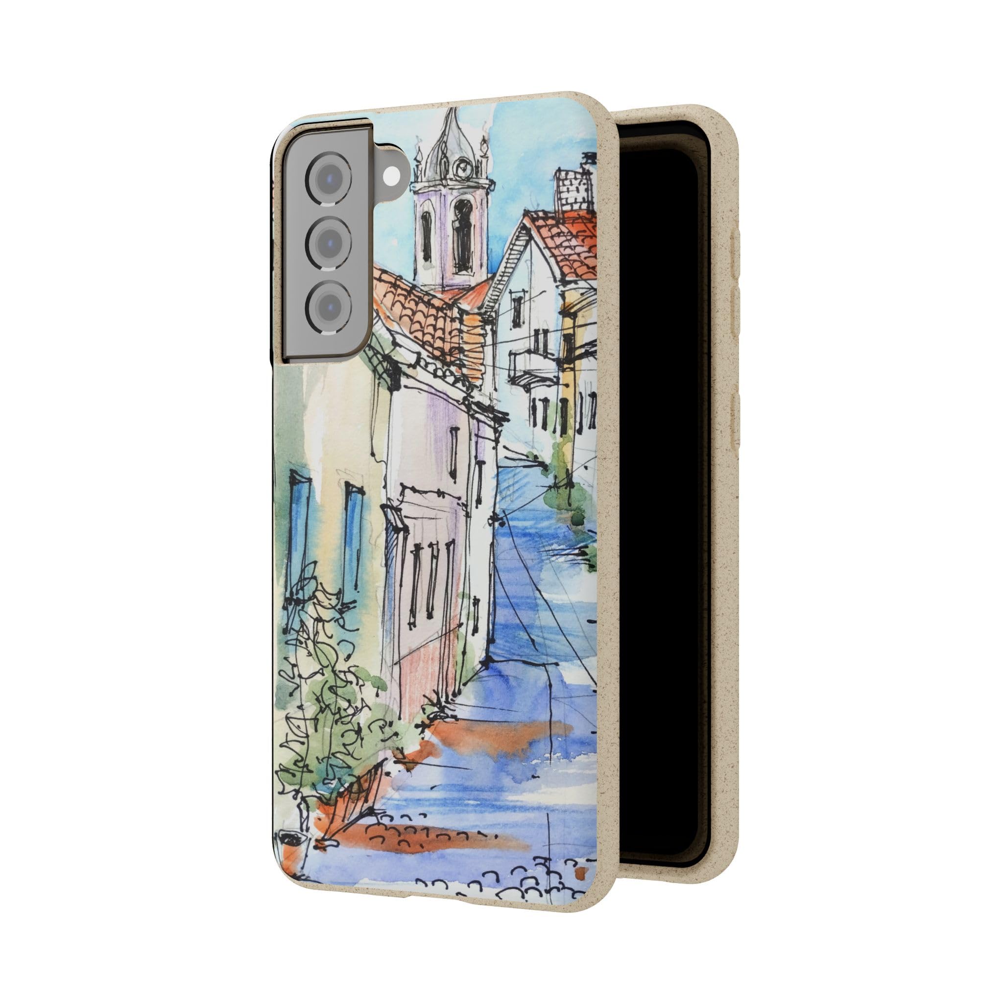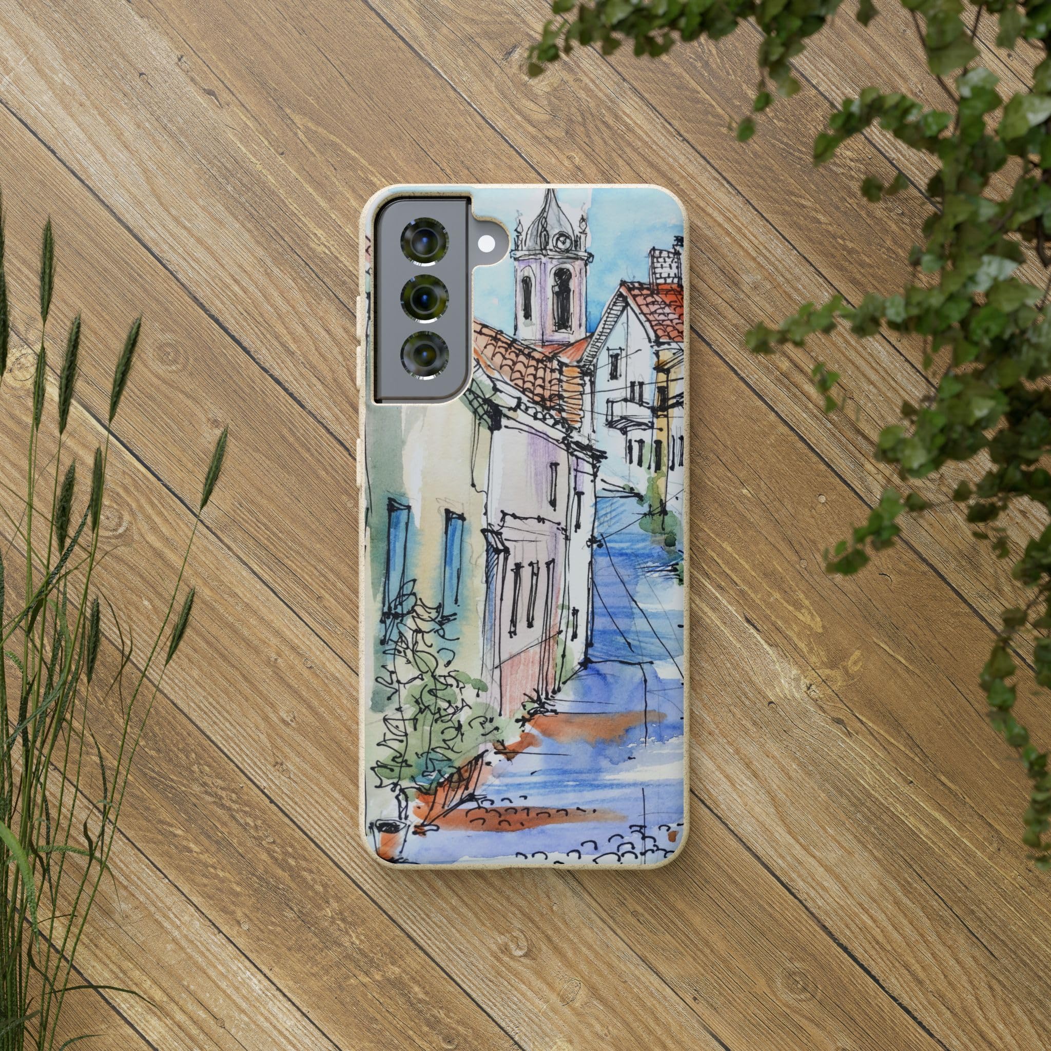 Protect your phone in style while protecting the planet! Embrace nature with our European Town Art Biodegradable Phone Case, featuring a charming illustration of a colorful European street scene. The design showcases quaint cobblestone roads, vibrant historic homes, and a picturesque chapel, all beautifully rendered in watercolor and fine pen detail. Perfect for lovers of travel-inspired art, European architecture, and the warm, nostalgic feel of hand-painted urban landscapes. Crafted from eco-friendly, compostable materials, this sustainable phone case not only protects your device but also supports a greener planet — naturally biodegrading within 160 days of disposal. It’s lightweight, durable, and fully supports wireless charging for effortless everyday use. Available for multiple phone models. Order yours today and carry the beauty of nature wherever you go! Details: .: Materials: PLA and PBAT polymers, bamboo fibre .: Matte finish .: Wireless charging compatible .: Precise cut outs for connectivity .: Might have a natural scent