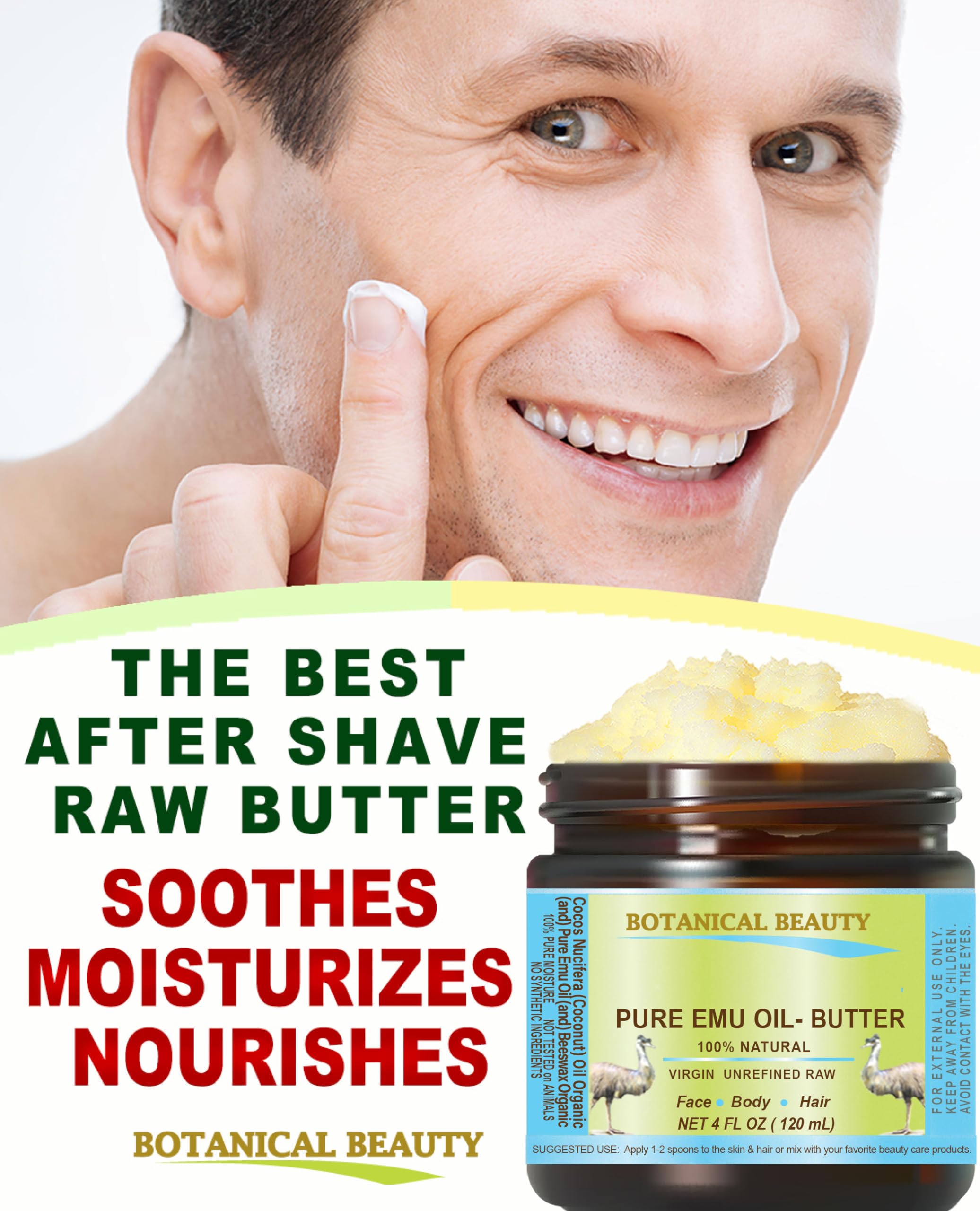 Botanical Beauty PURE EMU OIL BUTTER is widely considered a "Beauty Oil Butter ". PURE EMU OIL BUTTER is Anti-aging, Anti-wrinkle, Brightening, Hydrating, Moisturizing, Nourishing, Rejuvenating, Smoothening, Softening PURE EMU OIL BUTTER is a remarkable and stable source of vitamin E, vitamin B, vitamin C, Omega 3, Omega 6 and Omega 9 Essential Fatty Acids, Palmitic Acid, Stearic Acid, Oleic Acid, Gamma-linolenic Acid and minerals BENEFITS for SKIN: PURE EMU OIL BUTTER is currently considered to be the best oil for natural, anti-aging skin care products with restorative properties for all skin types, especially for dry or mature aging skin, chapped and cracked skin, balances the moisture in the skin, and leaving skin soft and smooth. PURE EMU OIL BUTTER provides intense hydration without clogging pores, making it an excellent choice for various skin types. The butter helps maintain skin's moisture balance, leaving it soft, supple, and nourished. Use topically for damaged skin like BURNS, WOUNDS, CUTS, SCARS, ITCHY, SCALY, ACNE SCARS, DRY SKIN, CRACKED SKIN, Cracked Hands, CHAPPED LIPS, CELLULITE IRRITATED SKIN CONDITIONS SUCH AS ECZEMA and PSORIASIS. BENEFITS for HAIR: Hair Nourishment and Conditioning. PURE EMU OIL BUTTER is lightweight and quick-absorbing texture serves as an effective hair conditioner, promoting smoothness and shine without weighing hair down. Use topically for DRY HAIR, DAMAGED HAIR and DRY SCALP, DANDRUFF. It repairs split ends and broken strands, tames frizzy hair, smoothes the surface, and strengthens and softens hair. By strengthening and moisturizing your hair, you help it retain waves and curls. BENEFITS for NAILS: helps to keep nails strong and healthy and keep cuticles soft. Ideal for Massage. PURE EMU OIL BUTTER is an excellent choice for massage therapy, allowing for smooth application and easy absorption into the skin. Recommended lotions, Creams: 5 – 20 %, Balms: 5 – 100 %, Bar Soaps: 5- 20% FOR FACE & BODY: Apply directly to the skin. Gently massage until fully absorbed. Follow with your favorite moisturizer. or Just mix a few spoons with your favorite cream, lotion, make-up remover, shower & bath gel, shampoos, face mask, and various lip balms. FOR HAIR: Apply directly to the hair. Apply 2-3 spoons to dry hair to tame frizz and add shine. Add 2-3 spoons to your own favorite shampoo or conditioner. Ingredients Cocos Nucifera (Coconut) Oil ORGANIC ( and ) Pure Emu Oil ( and ) Beeswax
