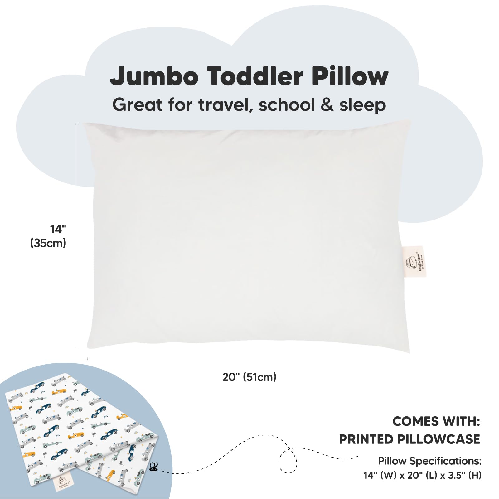 Ergonomically Designed – KeaBabies Jumbo Toddler Pillow 14x20, offers ergonomic support for healthy spinal alignment and all-night comfort. Note: Simply cold wash and tumble dry low to restore its fluffiness after opening from vacuum package.