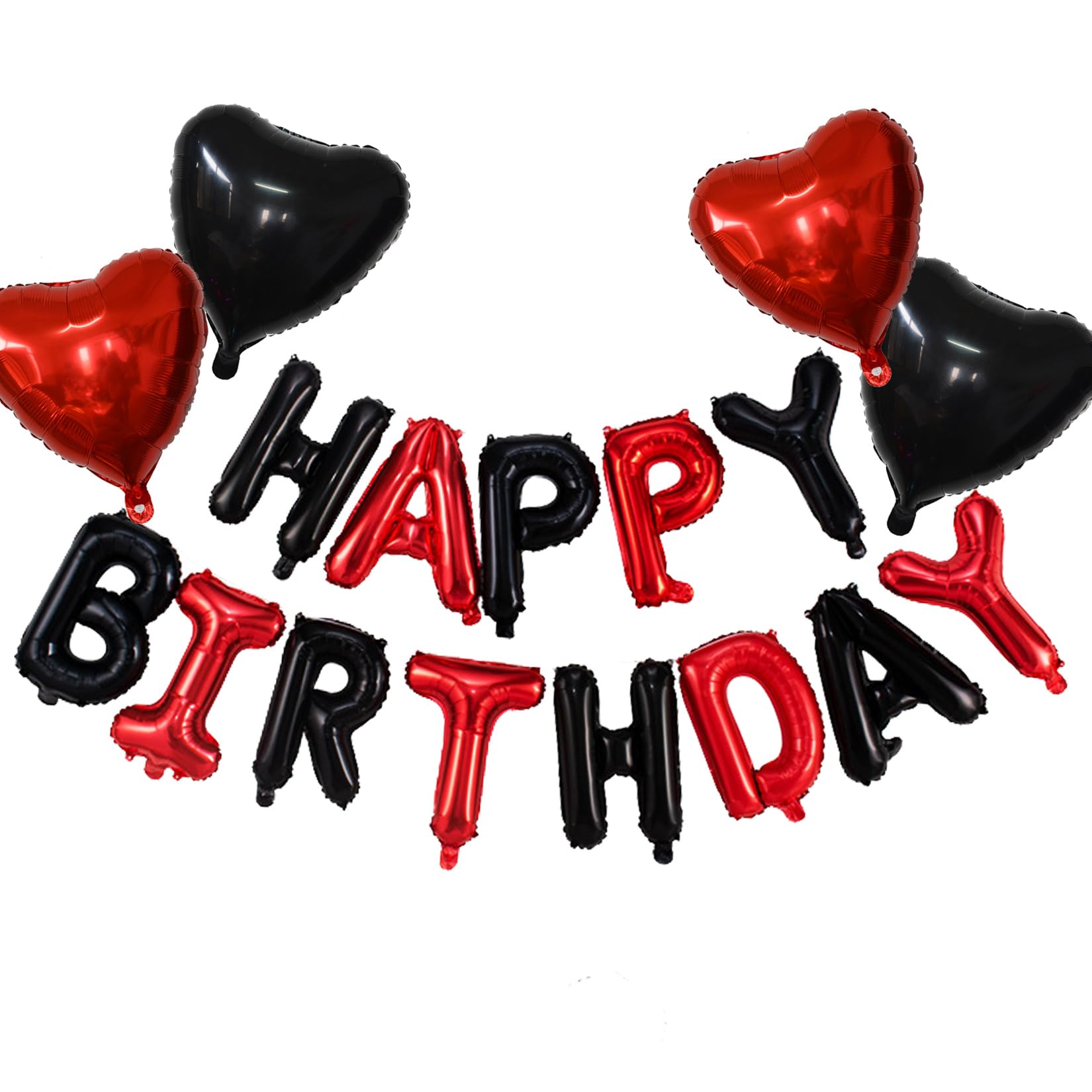 【Packaging content】“HAPPY BIRTHDAY” Aluminum Foil Balloon * 1, two 18-inch red hearts and two 18-inch black hearts,along with 1 straw and 1 ribbon. Each letter balloon measures approximately 16 inches.