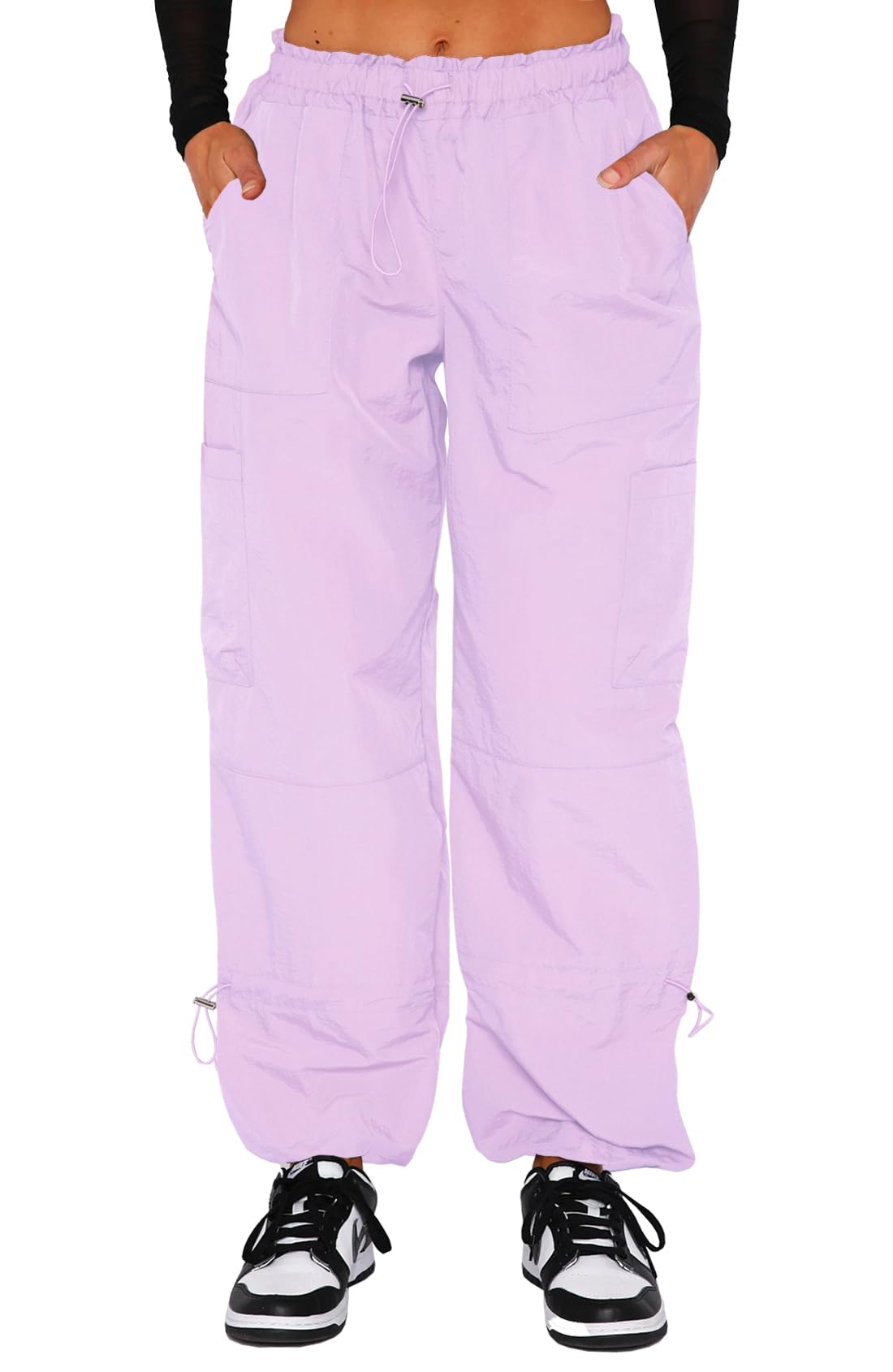 Trendy clothes for women: Our womens cargo pants with pockets combine a womens parachute pants design and a flare wide leg fit, which is bold and fun, style of the 90s, making our cargo pants a unique piece of bottom. With details like elastic waist band, side and cuff adjustable drawstring with toggle, 4 pockets, all make these adjustable cargo pants women a super chic piece in teen girl gifts trendy stuff collection