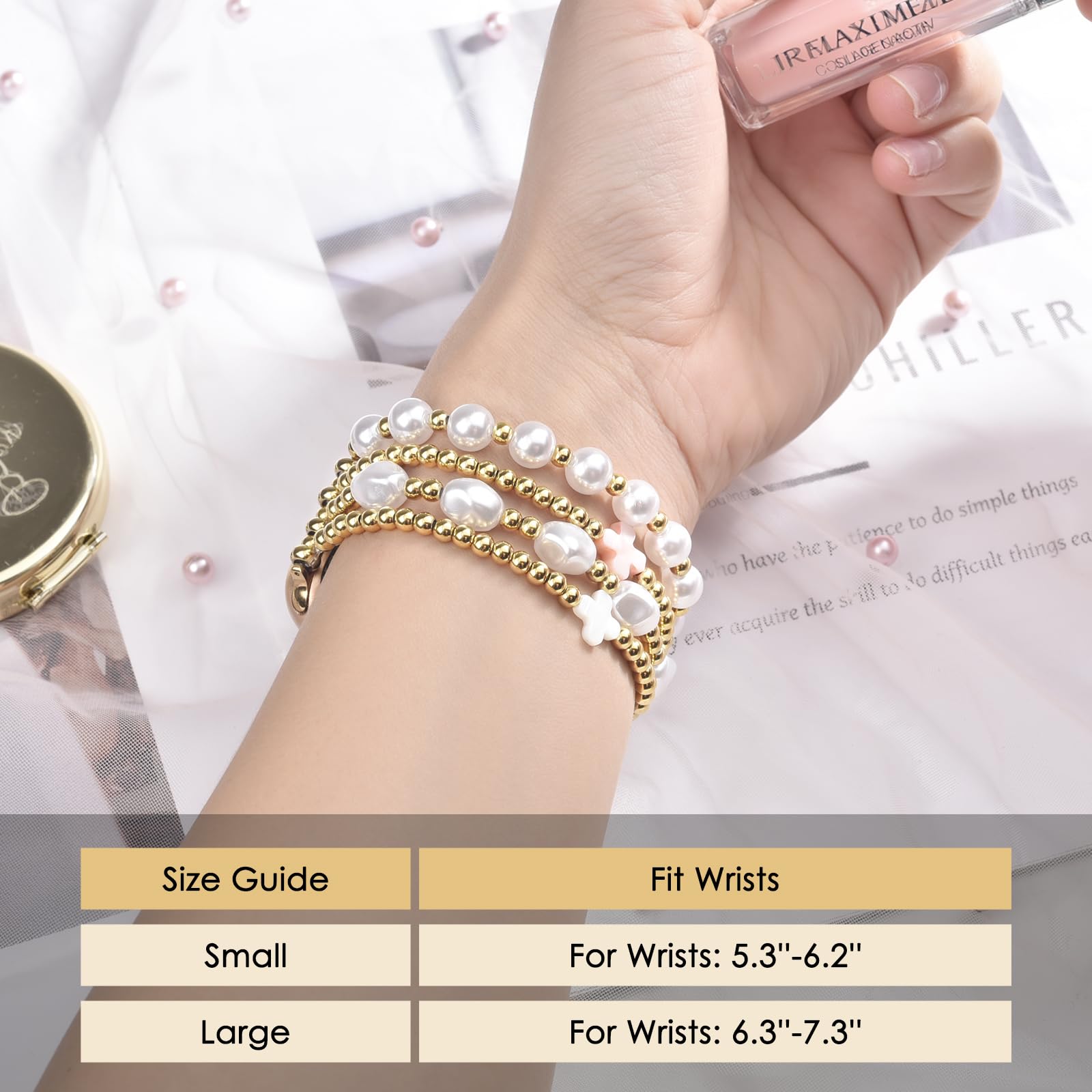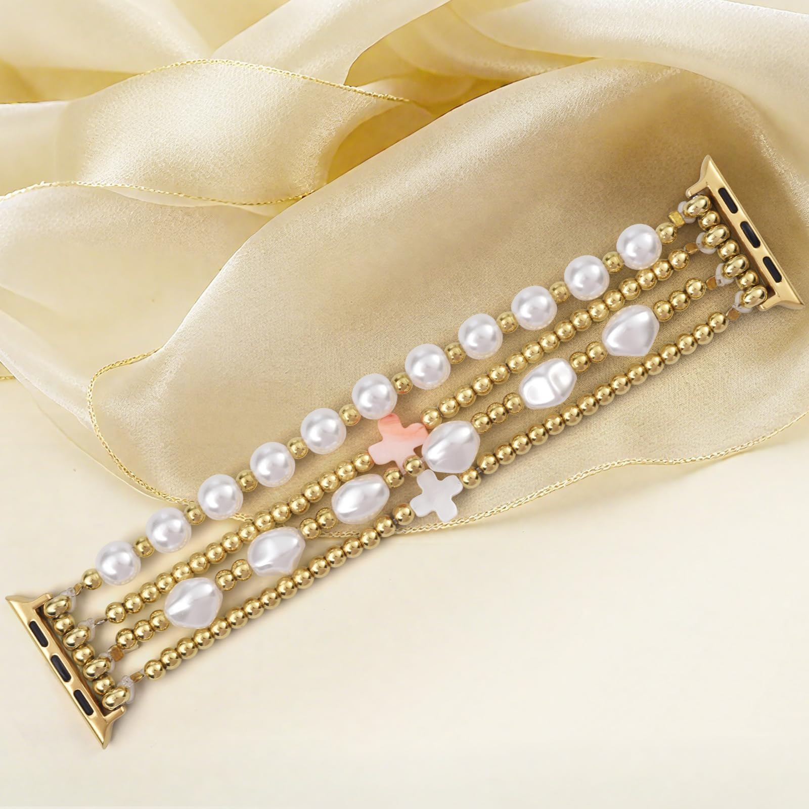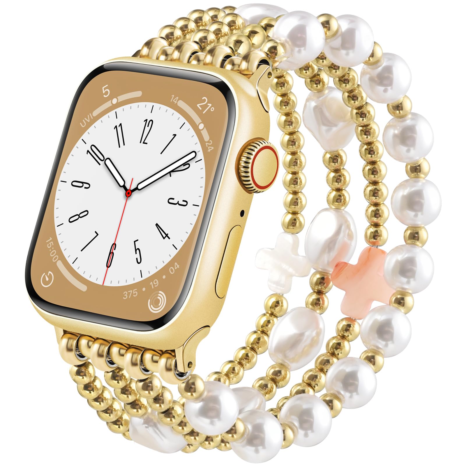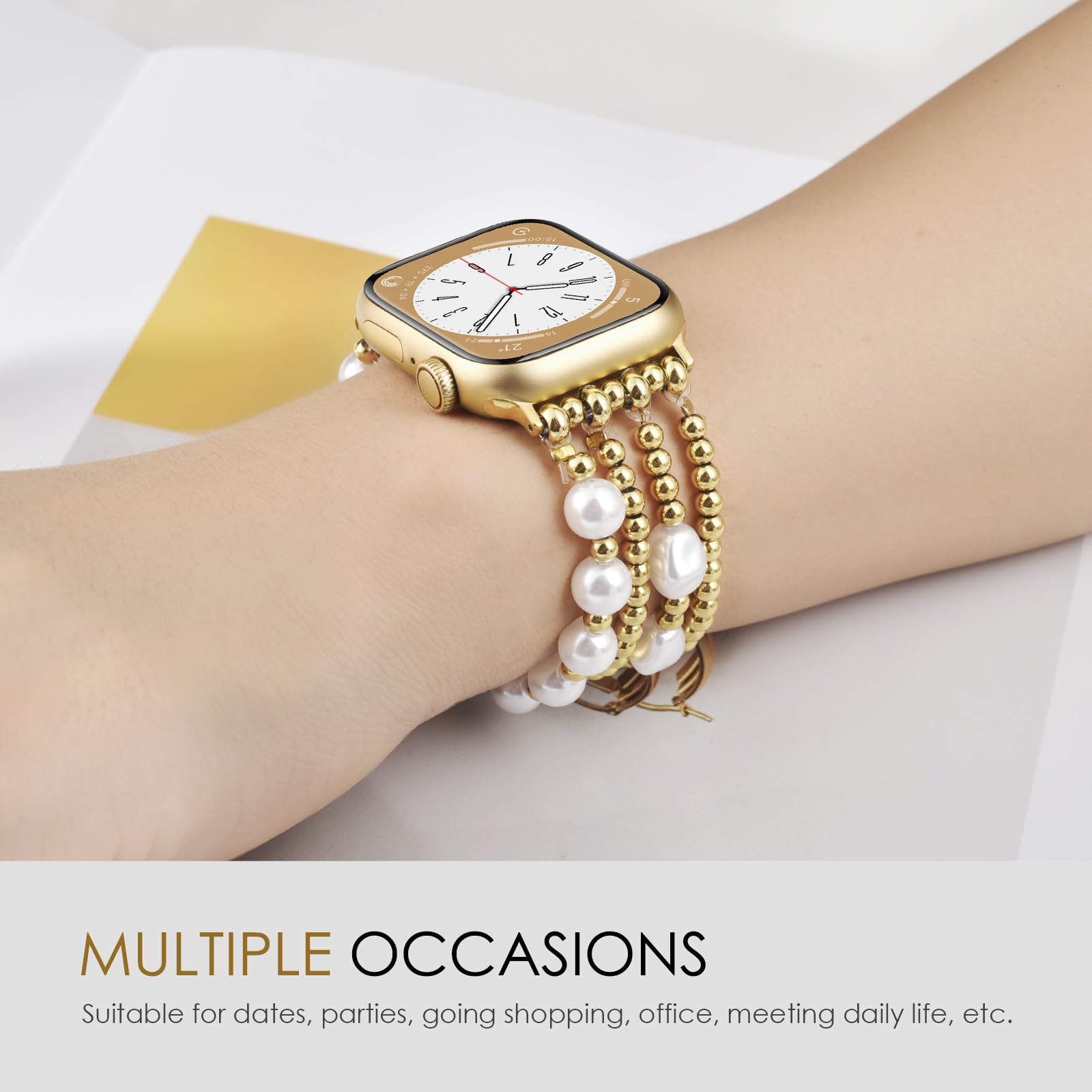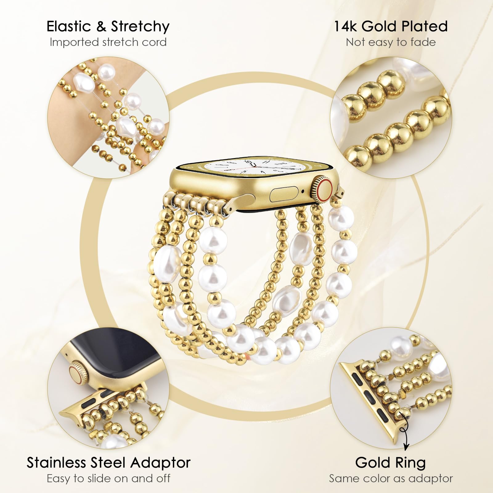Gold Beaded Apple Watch Band: Made of premium quality stainless steel with 14K real gold plating that won't fade easily and can maintain its luster for a long time. Apple watch beaded bands for women contain 2 gold beaded bracelets and 2 pearl-beaded bracelets. It's very comfortable to wear. It is an excellent choice for people with susceptible skin.