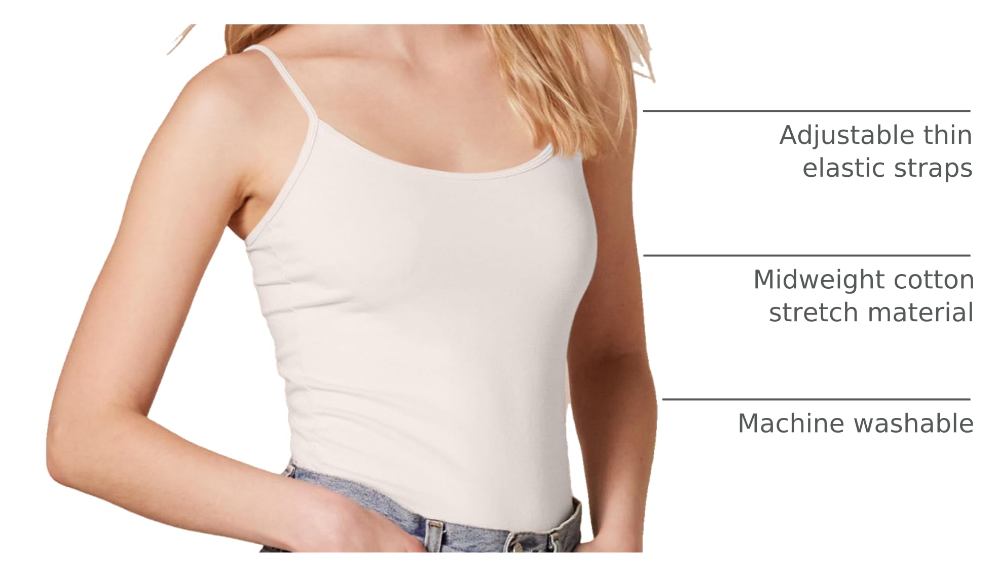 DETAILS: Features a scoop neckline, and adjustable thin elastic cami straps.