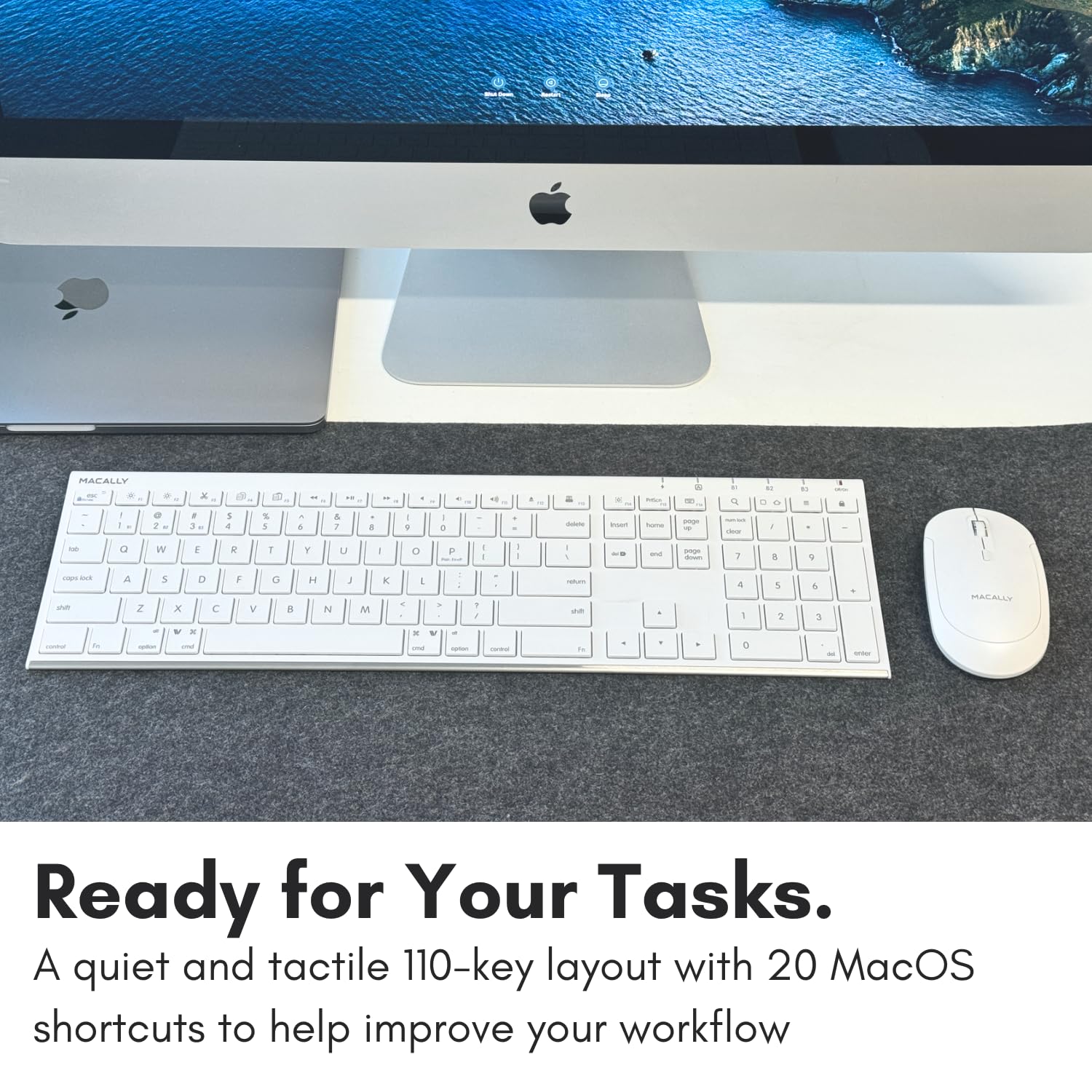 Ultra Slim and Comfortable Typing: Even with 110 keys, including 20 shortcut keys, presets, and a number pad, our Apple comptaible keyboard is only 15 millimeters in thickness (0.59 inches)