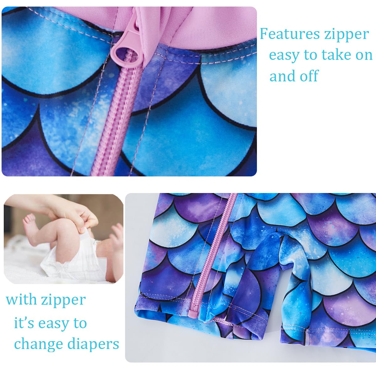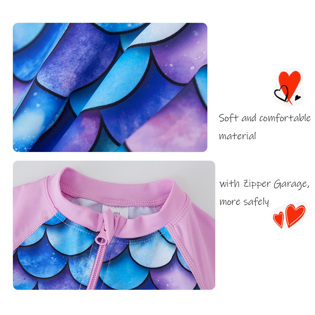 Excellent quality baby girl rash guard swimwear: Great smooth material, polyester and spandex, Lining: Polyester. Our infant girl long sleeve rash guard bathing suits elasticity for perfect fit, skin-friendly, quick dry, breathable, comfortable and soft wearing, easy-to-clean and stain resistant