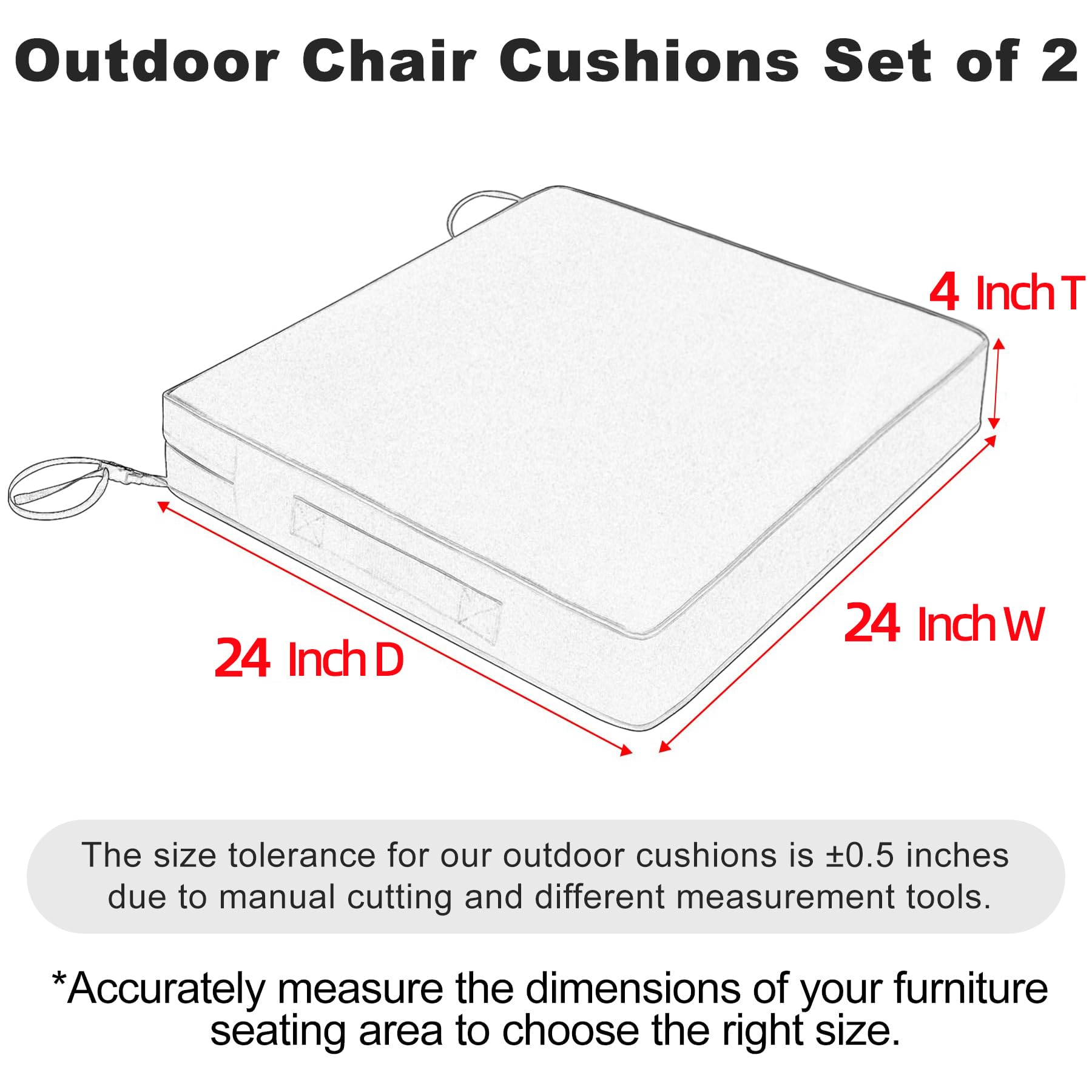 Size Selection - Including 2 outdoor chair cushions measuring 24” W x 24” D x 4” T ( The size description is only for the cushion size, accurately measuring the dimensions of your furniture's seating area before purchasing, make sure the cushion size fits your furniture ).