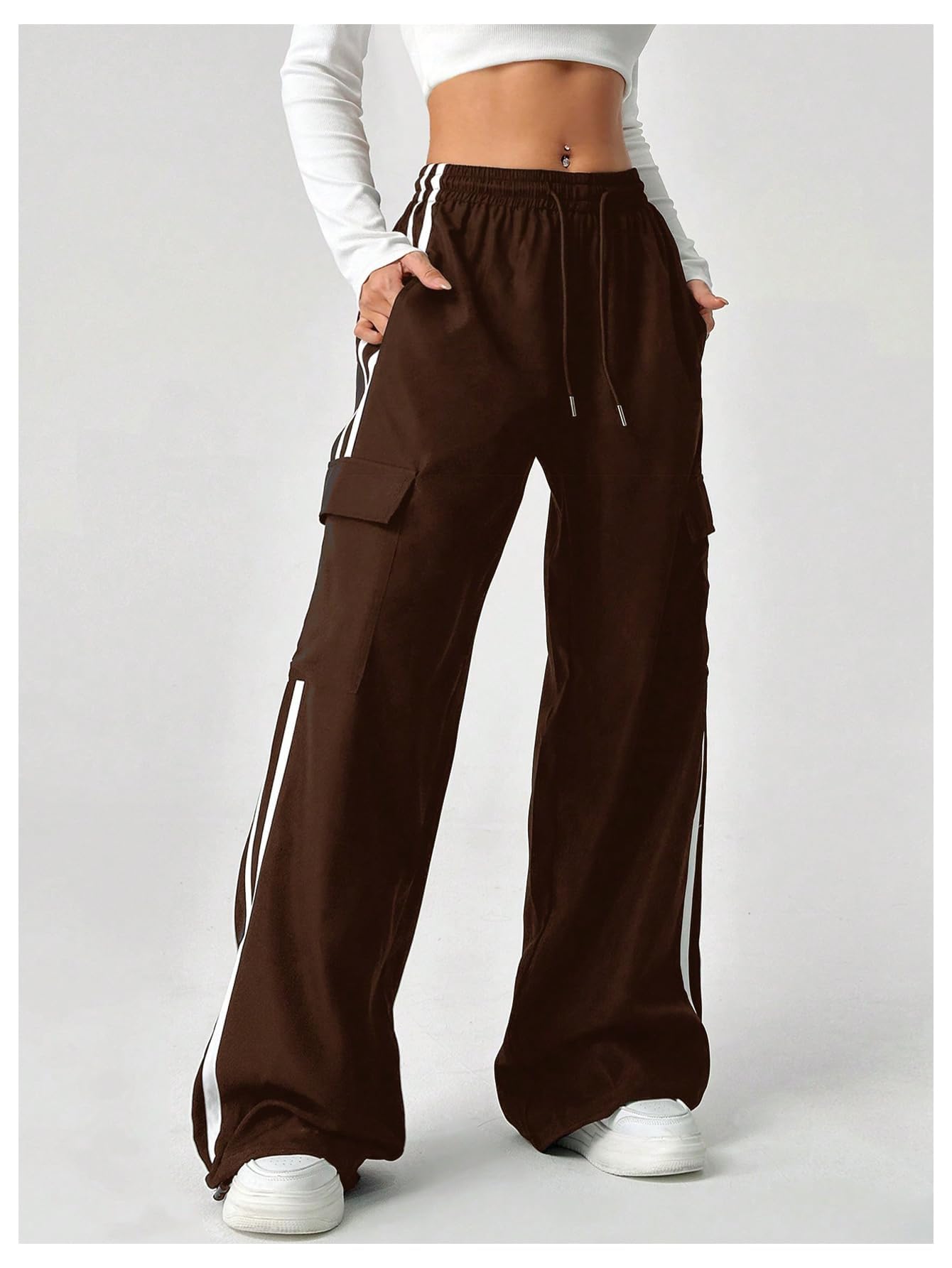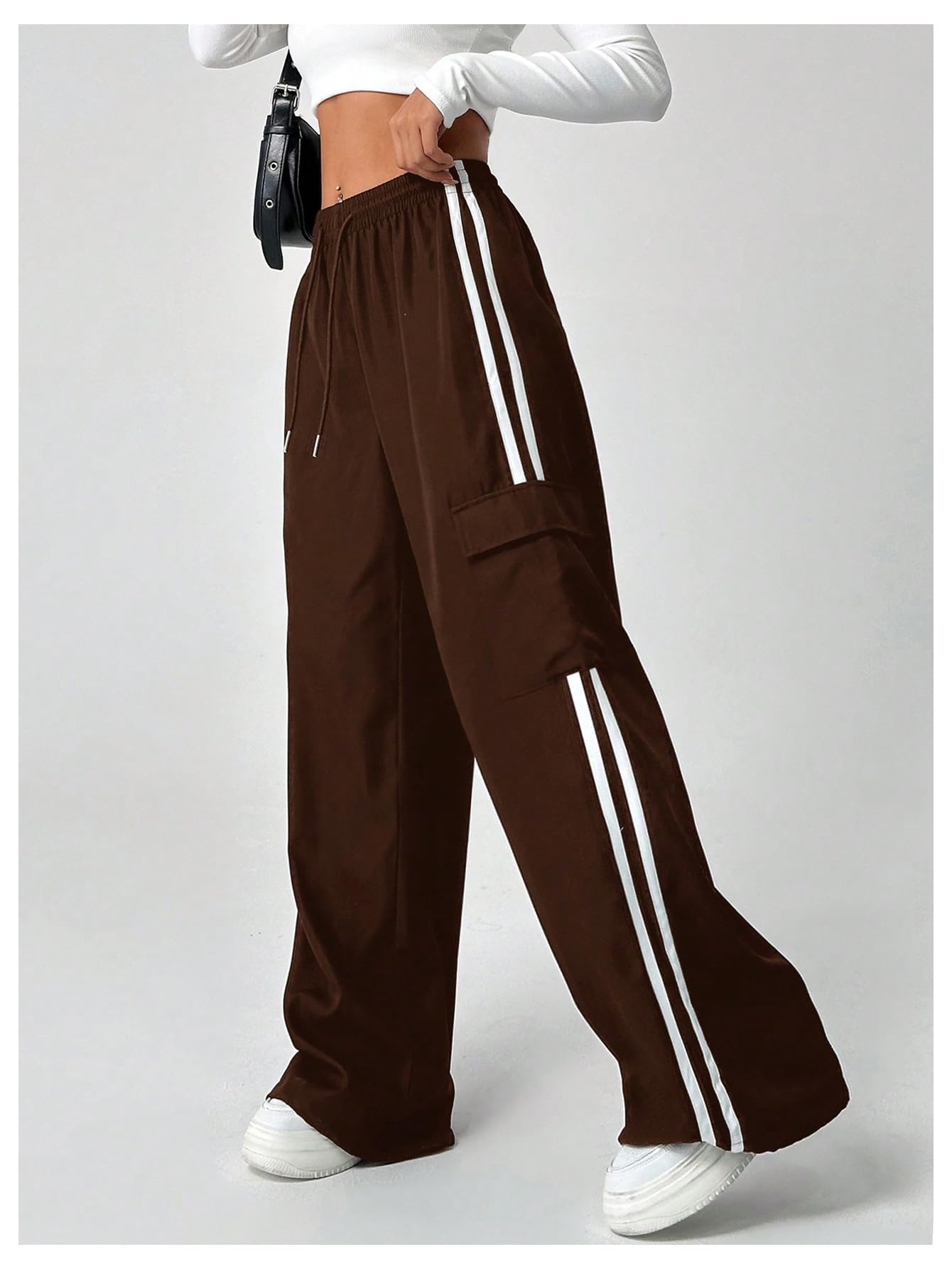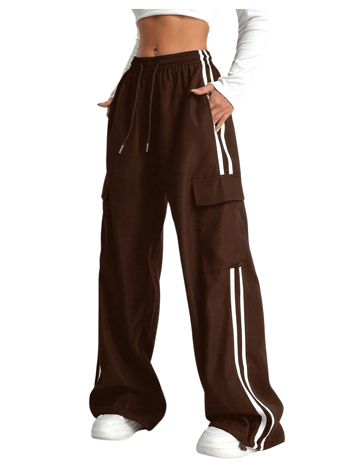 Drawstring Front and Hem, Elastic High Waist, Cargo Pocket Side, Straight Leg, Patched Stripes, Casual Long Pants