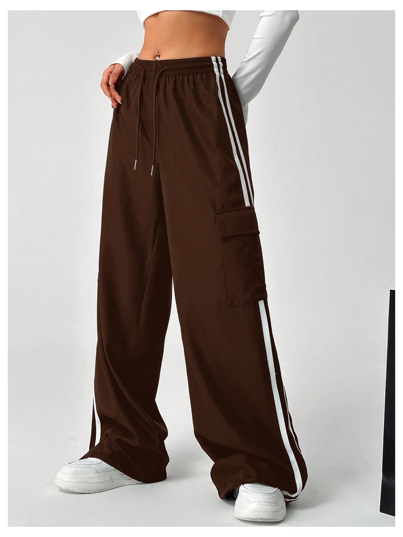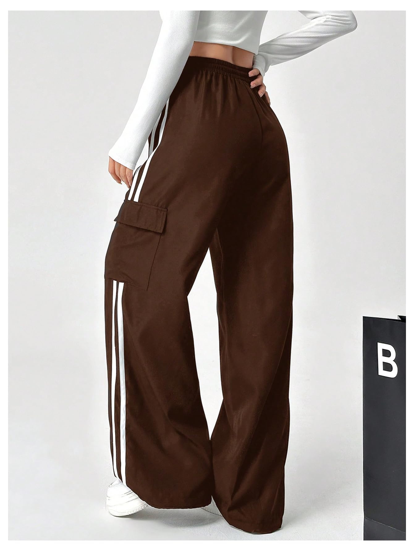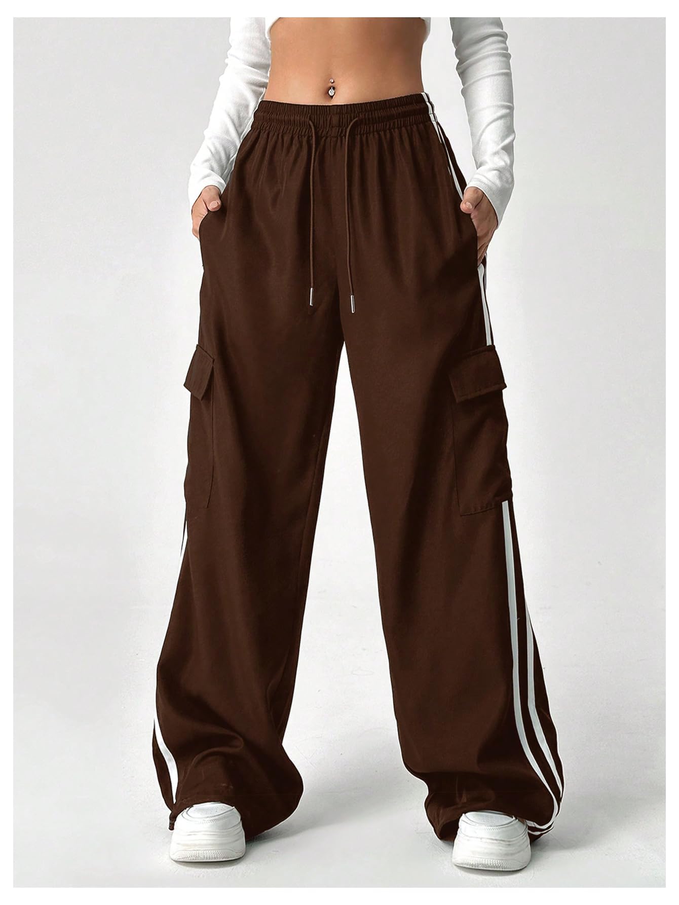 Drawstring Front and Hem, Elastic High Waist, Cargo Pocket Side, Straight Leg, Patched Stripes, Casual Long Pants