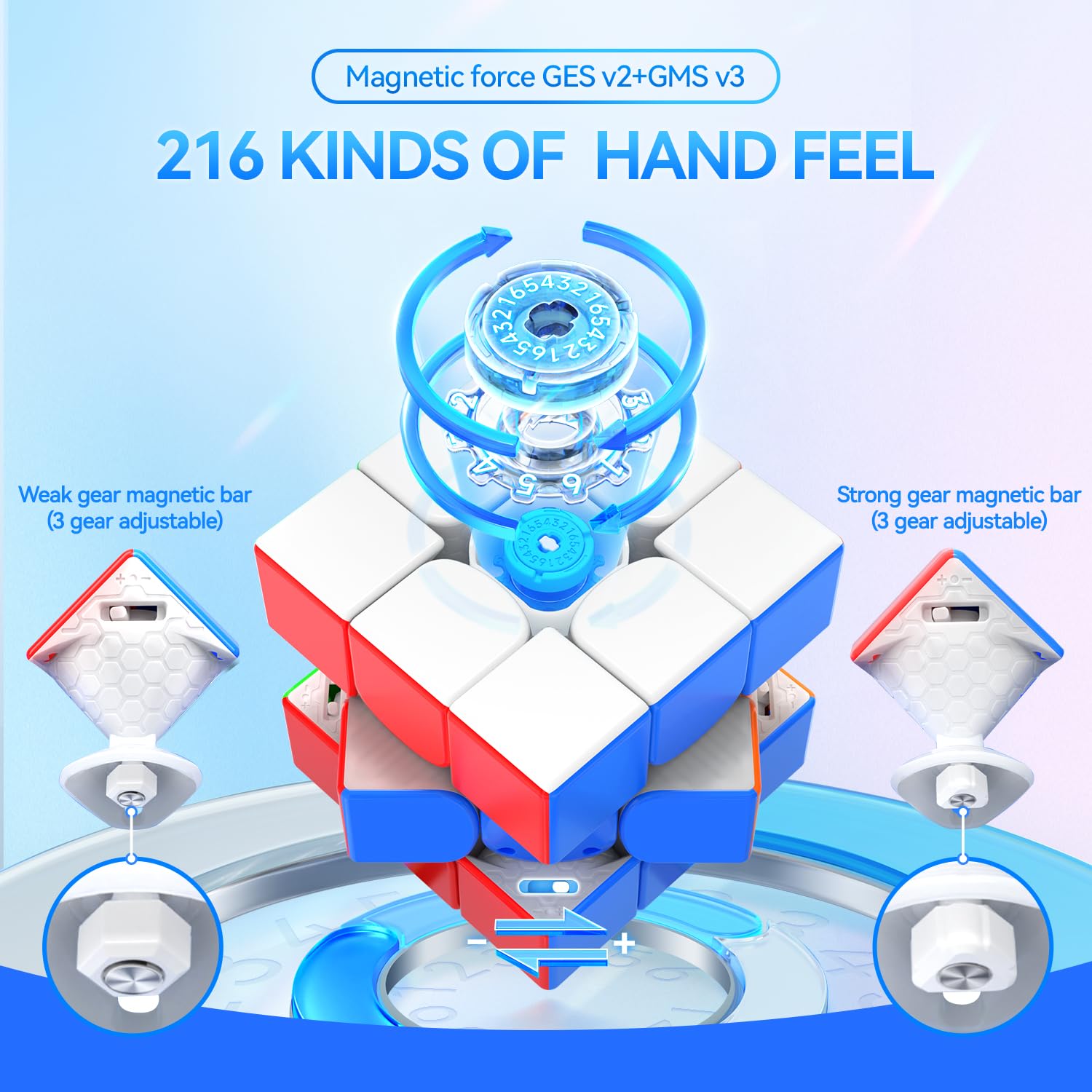 216 Kinds of Hand Feel: GAN Magnetic force GES v2 + GMS v3, from hard to smooth, from stretch to tight, the numerical system provides you with ultra-precise adjustment! And provide strong magnetic and weak magnetic two kinds of magnetic bars, customize your exclusive hand feeling