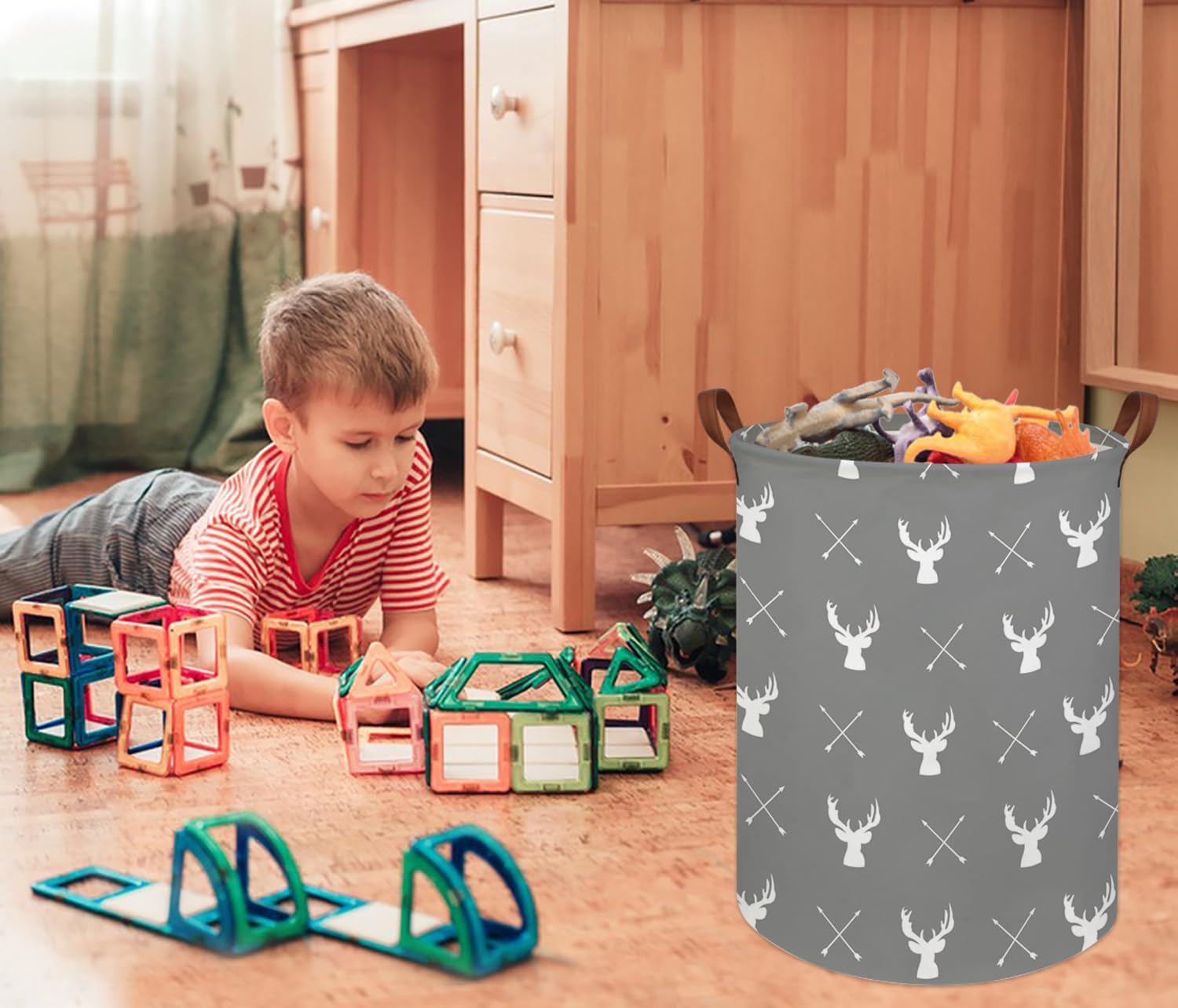 FEATURE:Sturdy handles make it easy to carry.Neutral color works well in any room.It’s soft and easy for my babies to self-serve their toys. Plus it’s cute and makes the playroom look neat.