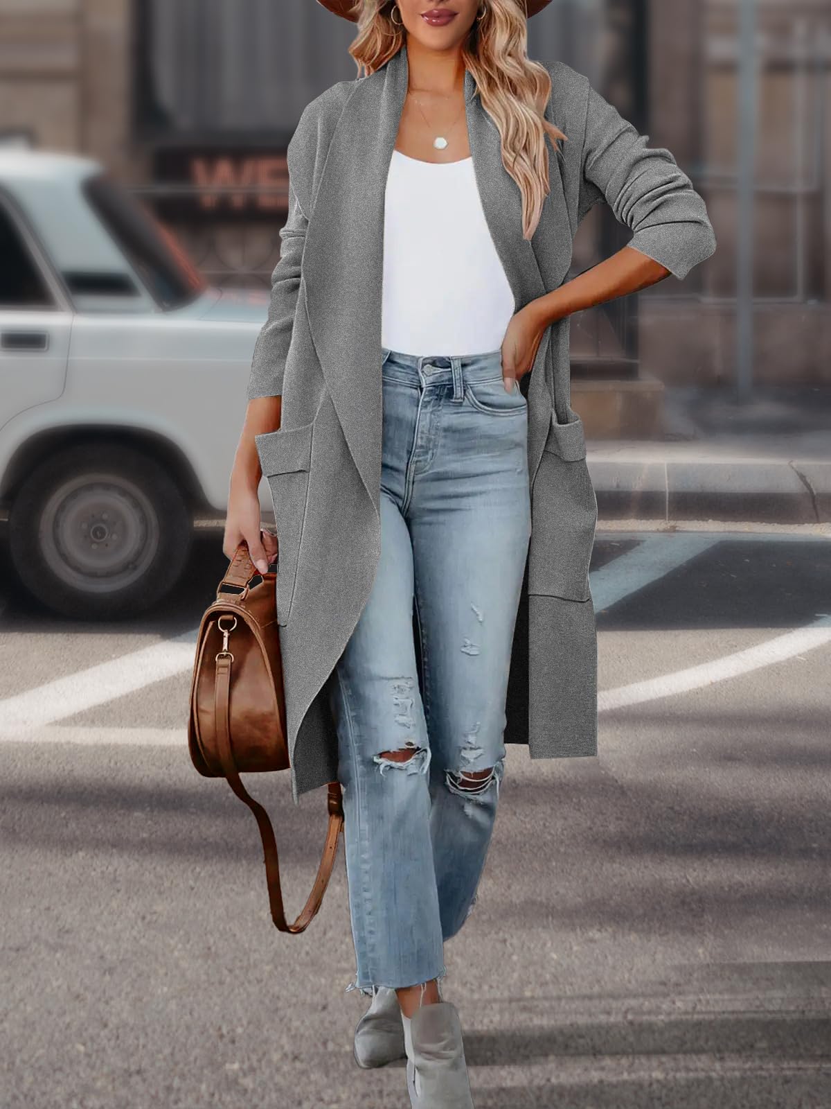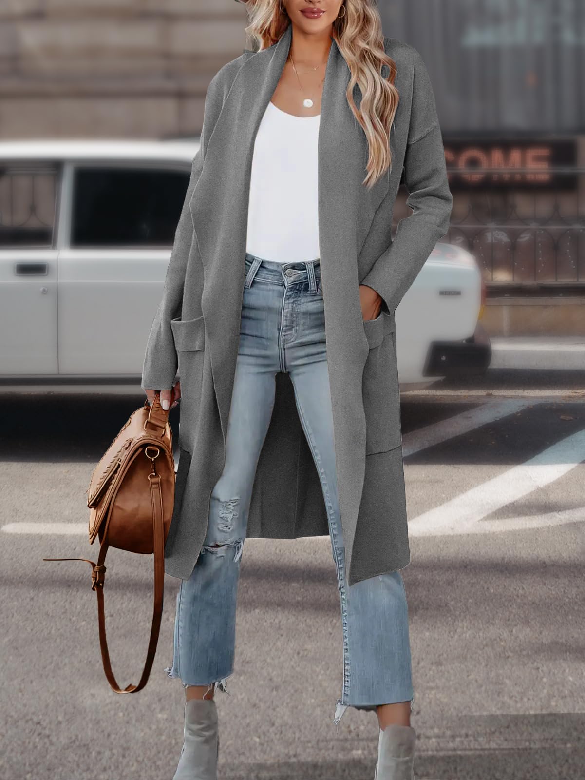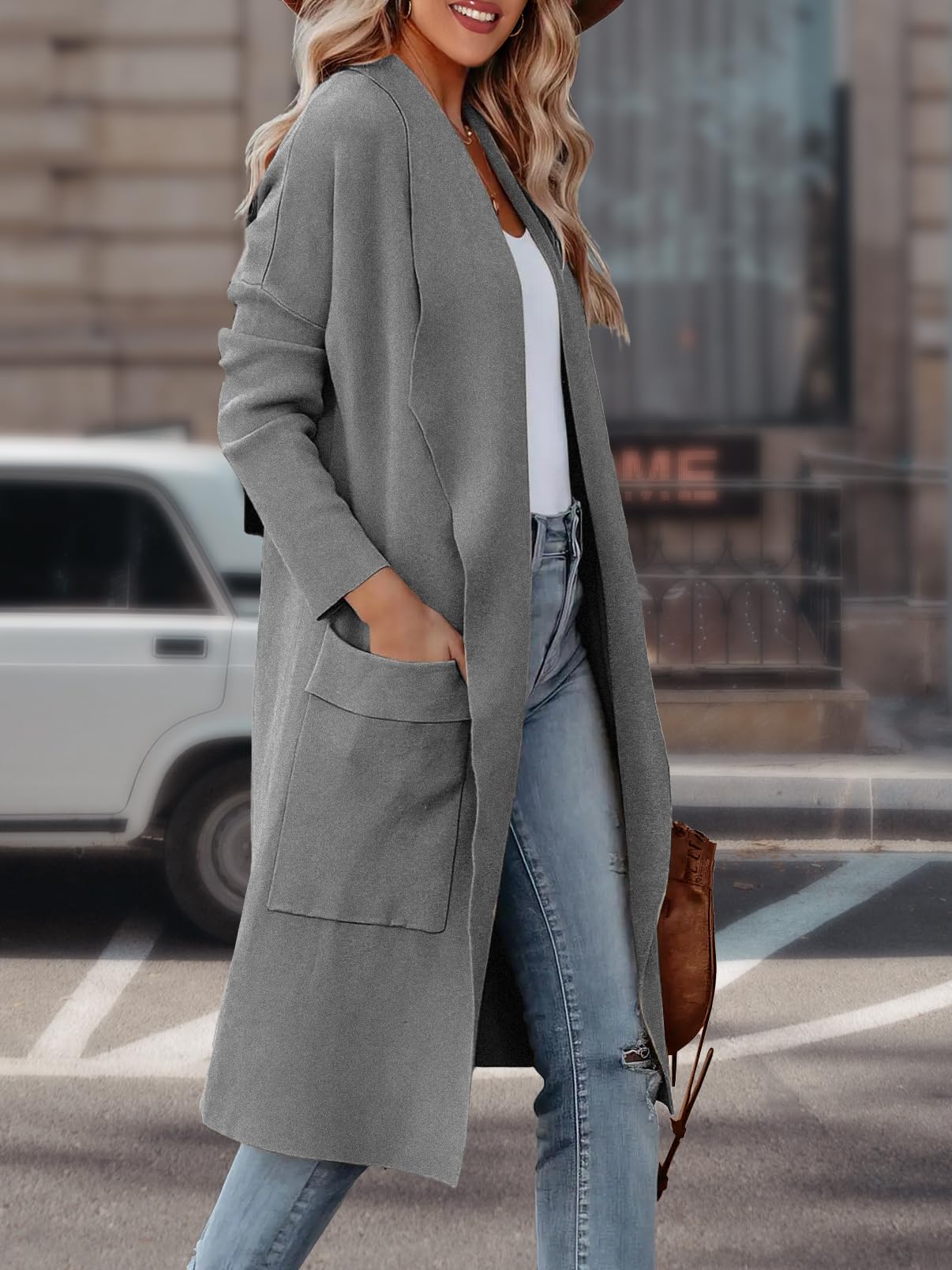 Features: Long Sleeve,Wrap Front, draped open front,pockets,thigh length cardigan,knitted,relaxed fit.