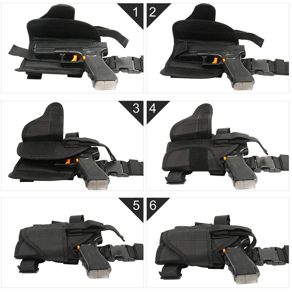 PRACTICAL: Tactical Pistol Thigh Gun Holster has wrap-around design with adjustable strap for safety and comfort. Usually for Left Hand, Left Thigh.