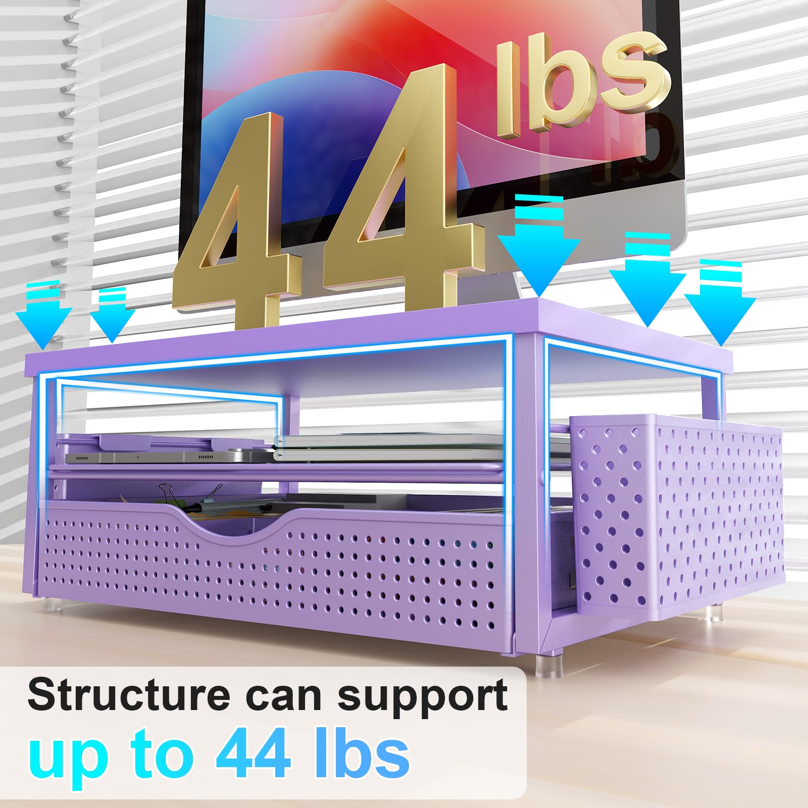 【Organized Storage】This desk monitor stand/organizer features two tiers of storage for files and notes. Equipped with two pen holders and a drawer , it effortlessly organizes pens, scissors, and other desk essentials, keeping everything within reach.