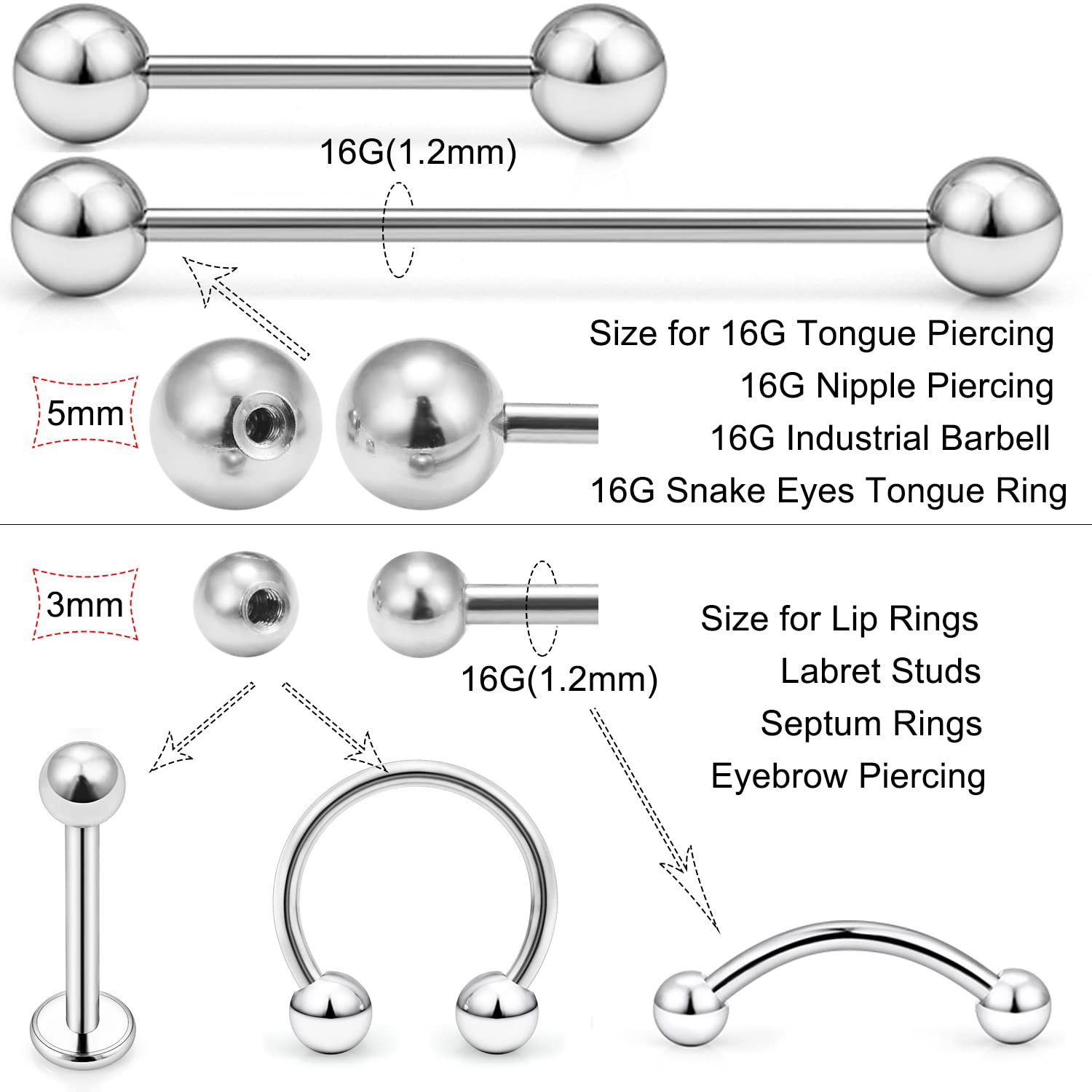 MEASUREMENTS: The Screw Hole Size is 16G (1.2MM); Ball Size: 5MM. This Size is Too Big Than the Normal Size. Color: Silver-tone, Rose Gold, Black, Blue, Rainbow, Gold-tone.