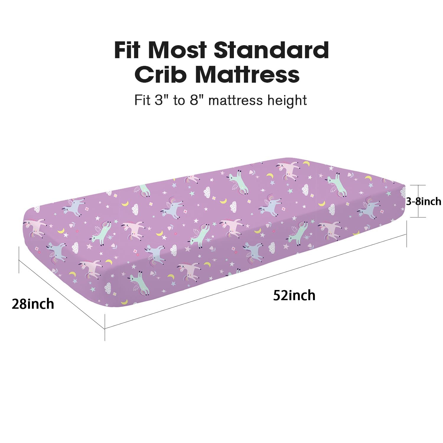 2-Pack Fitted Crib Sheets: Each Little Grape Land Crib Sheets set includes two crib sheets designed to perfectly fit standard nursery crib mattresses measuring 52” x 28” with a height range of 3” to 8”.