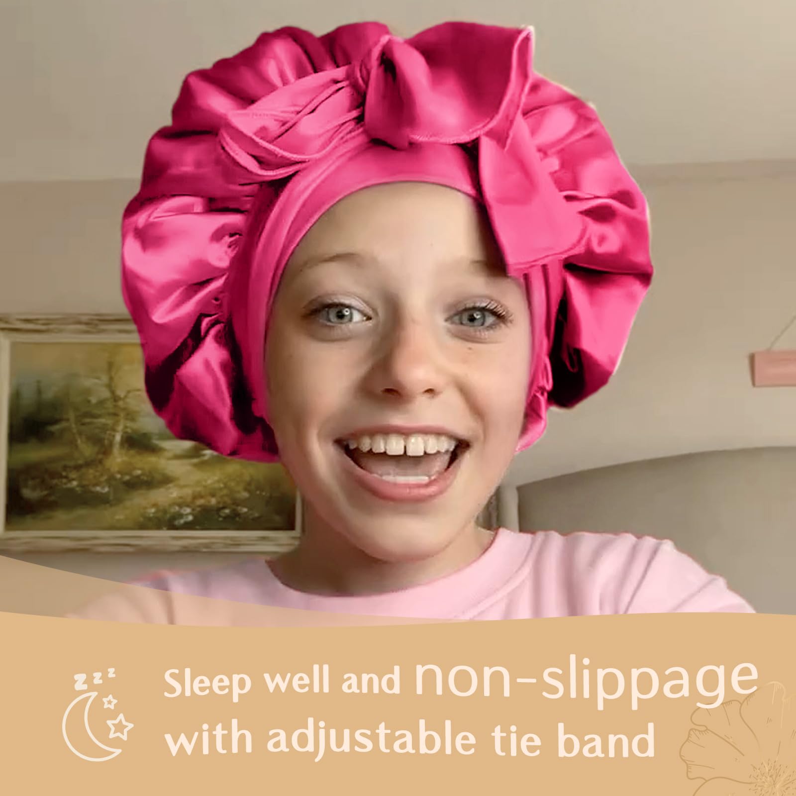 Good Qualtity: Great quality silky satin, smooth, lightweight and breathable and skin friend,and protect your kids hair and hair styles. Maintain moisture. No Color Shading or Fading. Unlike other cheap satin bonnets, this kids satin bonnet is really soft and comfortable