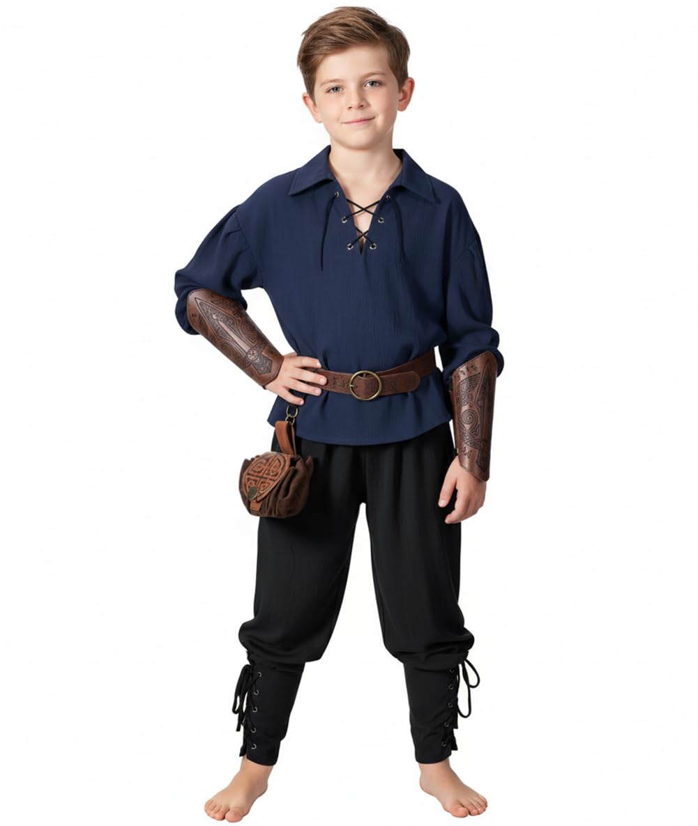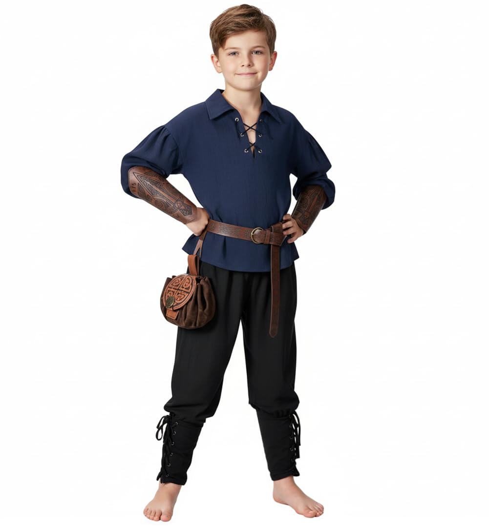 【Tunic Design】: Boy's Halloween costume shirt, vintage role-playing shirt, long sleeves, lace up neckline, loose fit, elastic wide cuffs, dropped shoulders, unique historical era style.