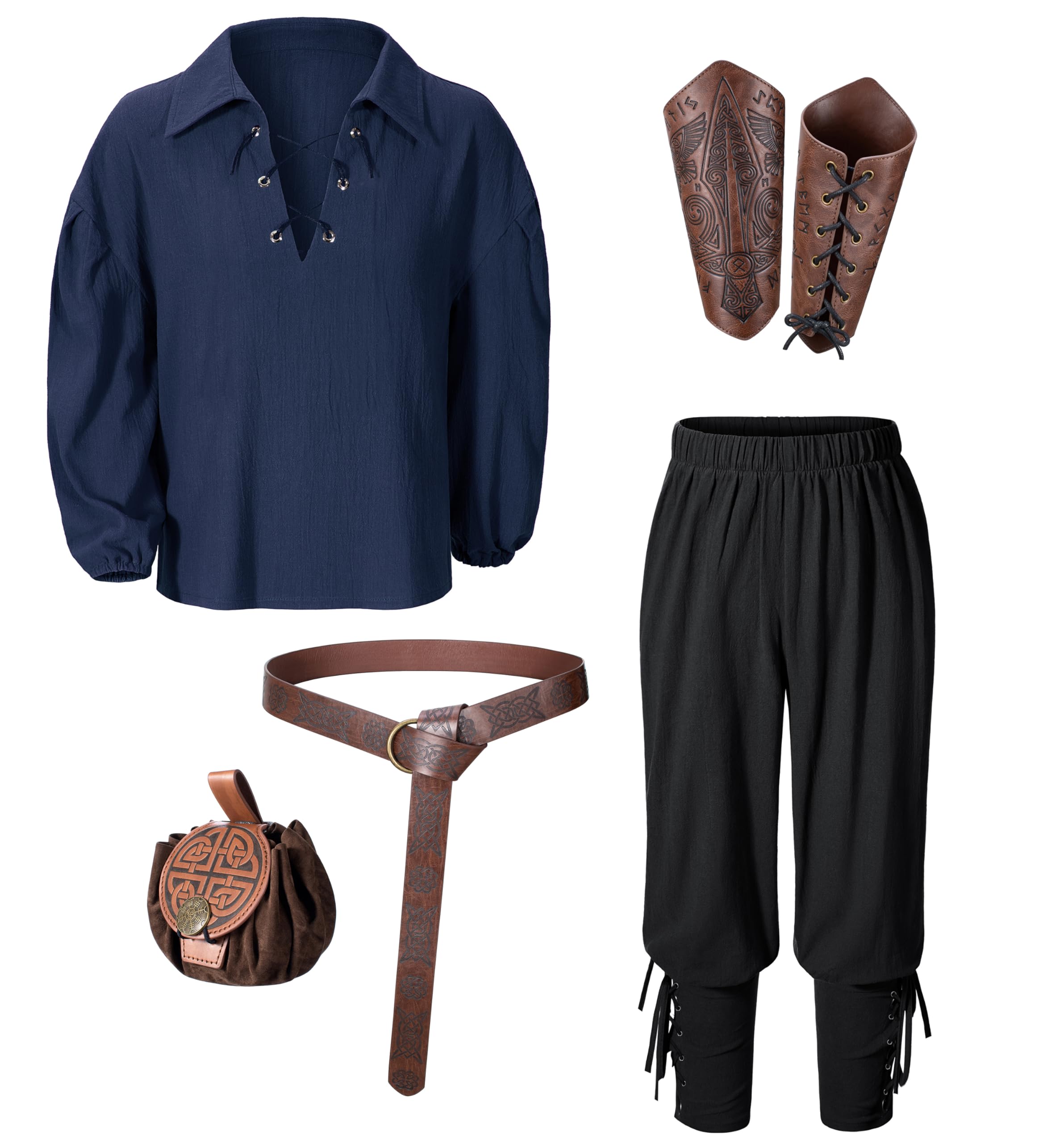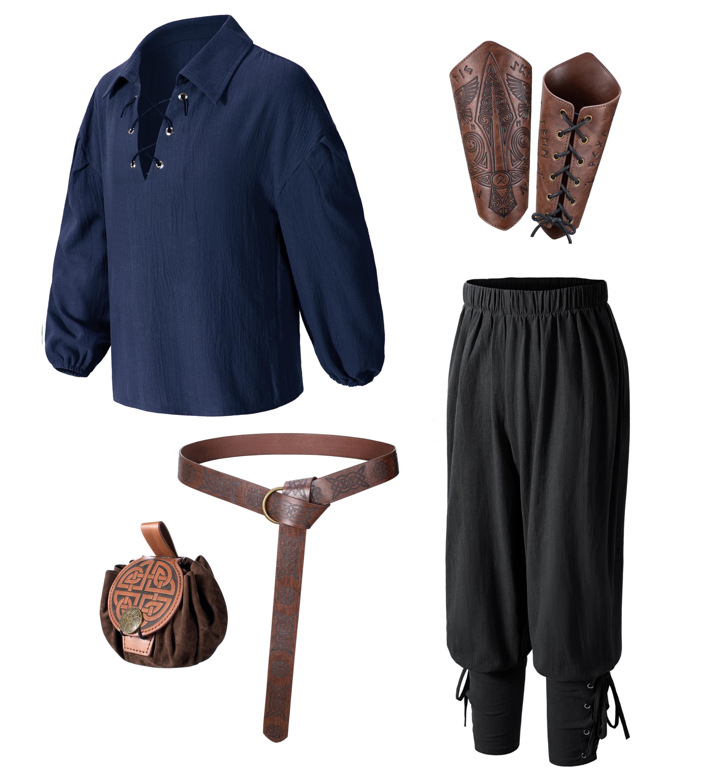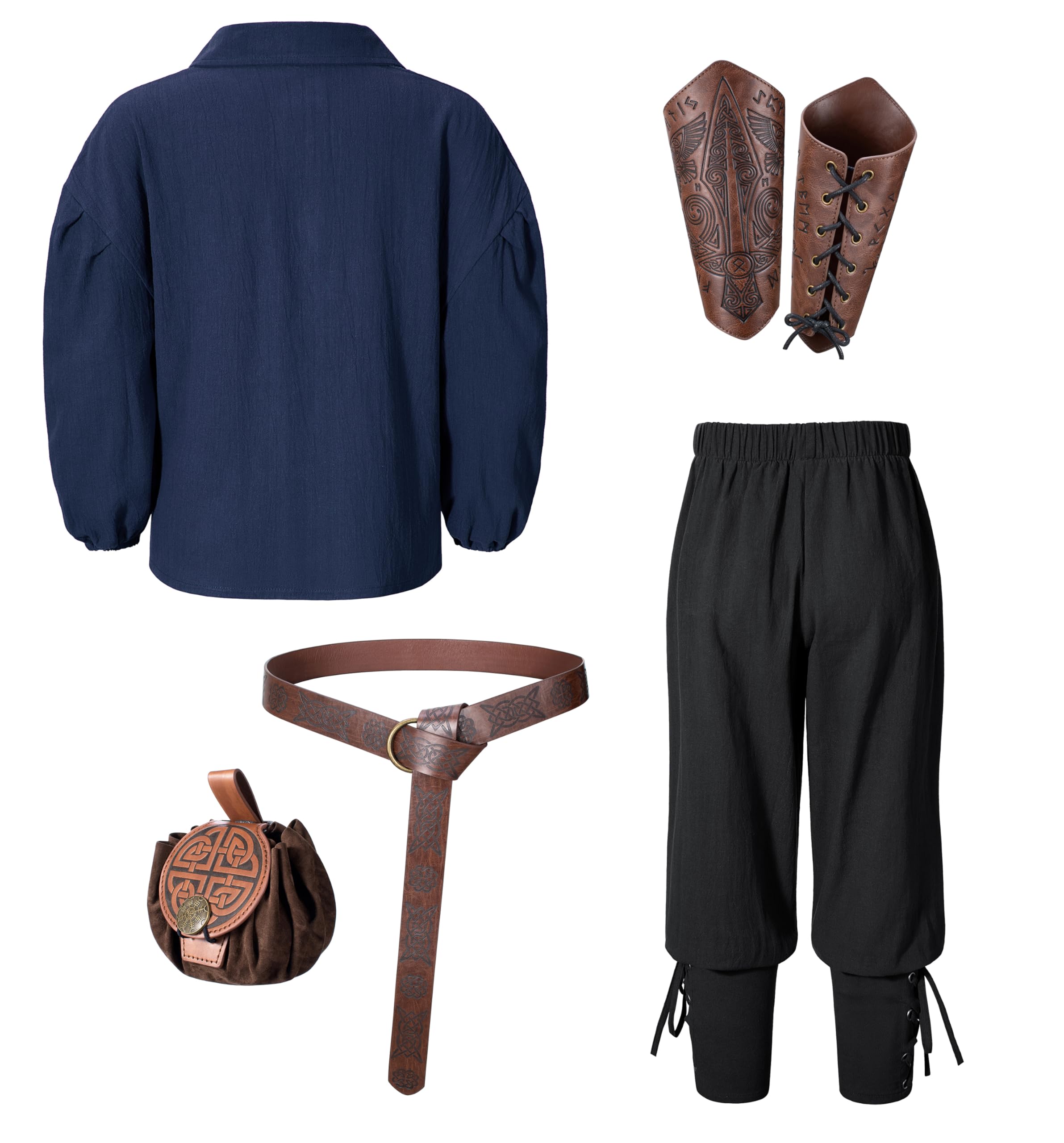 【Package Includes】6pcs set:Medieval Shirt,Vintage Pants,Leather Belt,Waist pouch,1 pair of arm Bracers.