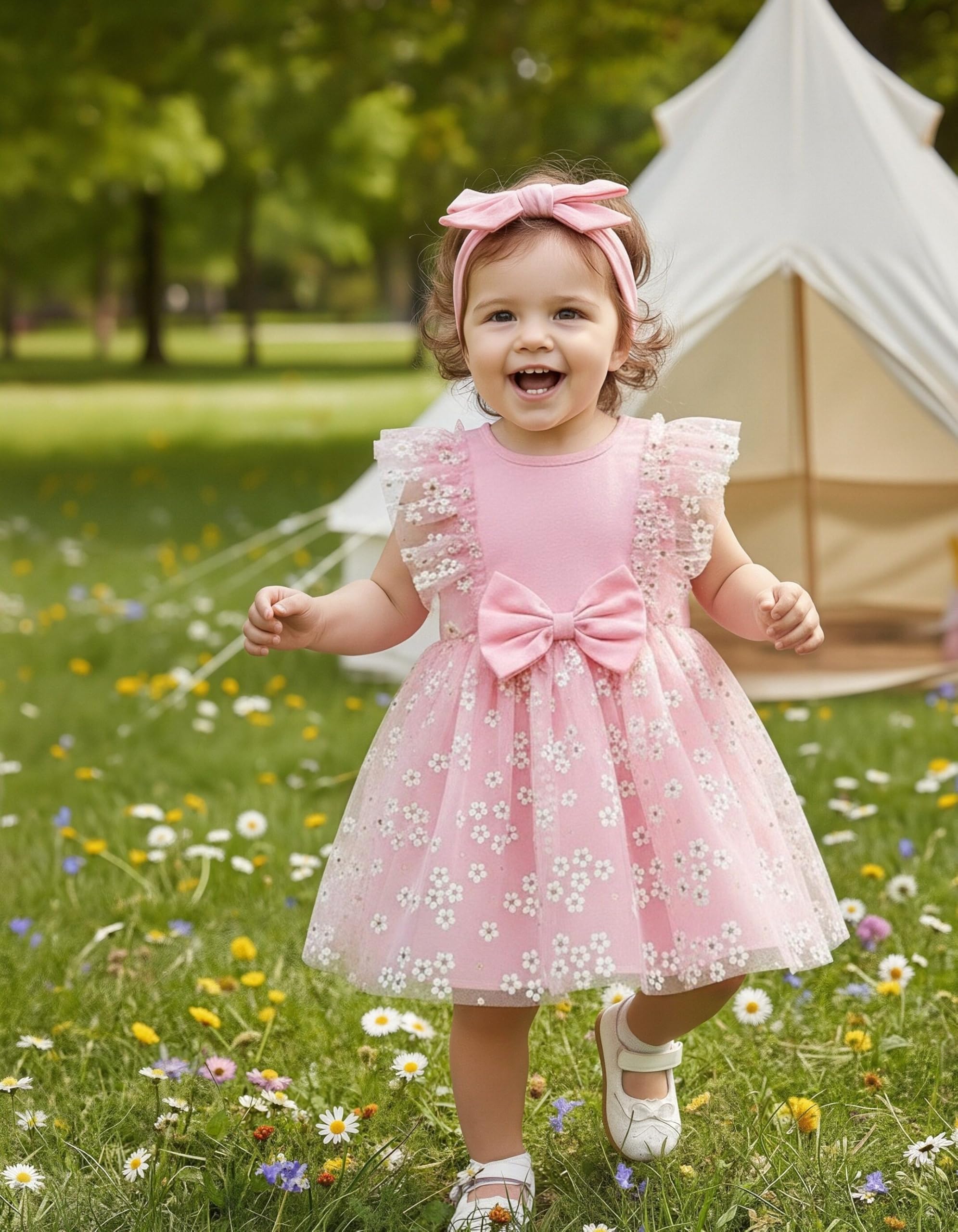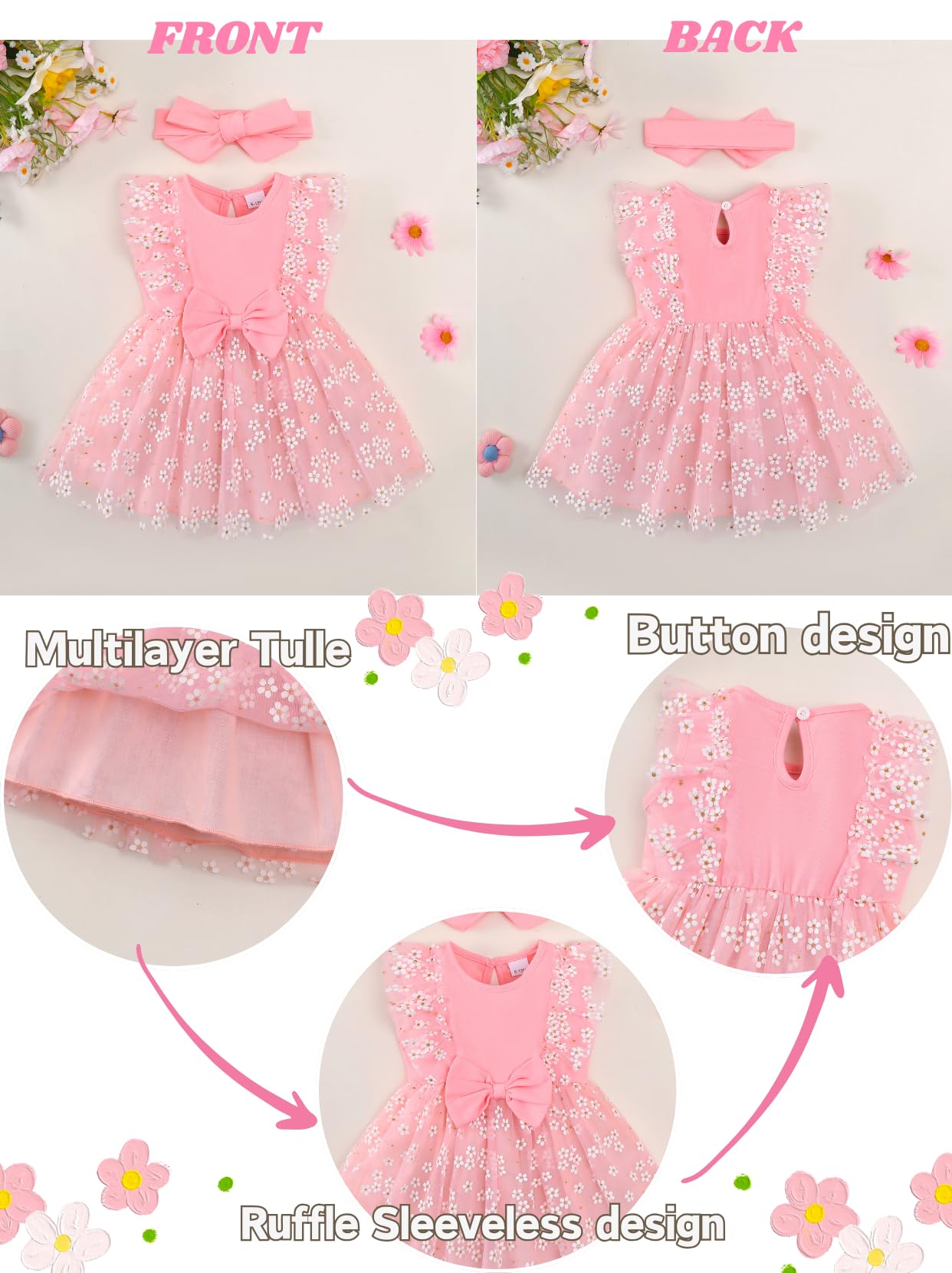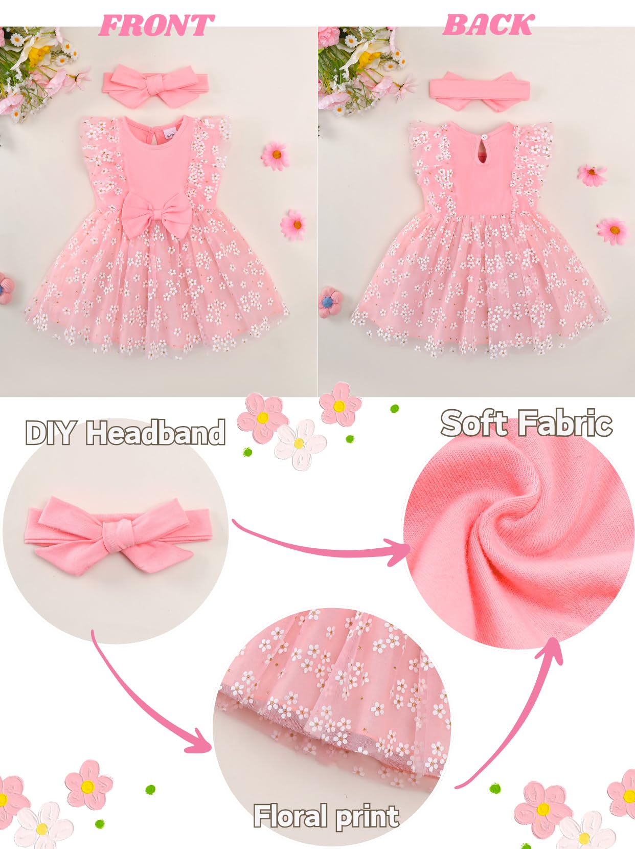 【Elegant Design for a Magical Look】This dress combines classic elegance with playful details, featuring a tulle tutu skirt, lace accents, white flower appliques, DIY headband, and a large bowknot, an untied headband accessory that requires tying, allowing for a customizable fit.The sleeveless sundress style is perfect for warmer days, while the boho-inspired headband adds a touch of whimsy. Available in pastel colors, it’s a perfect outfit for a fairy-tale princess look.