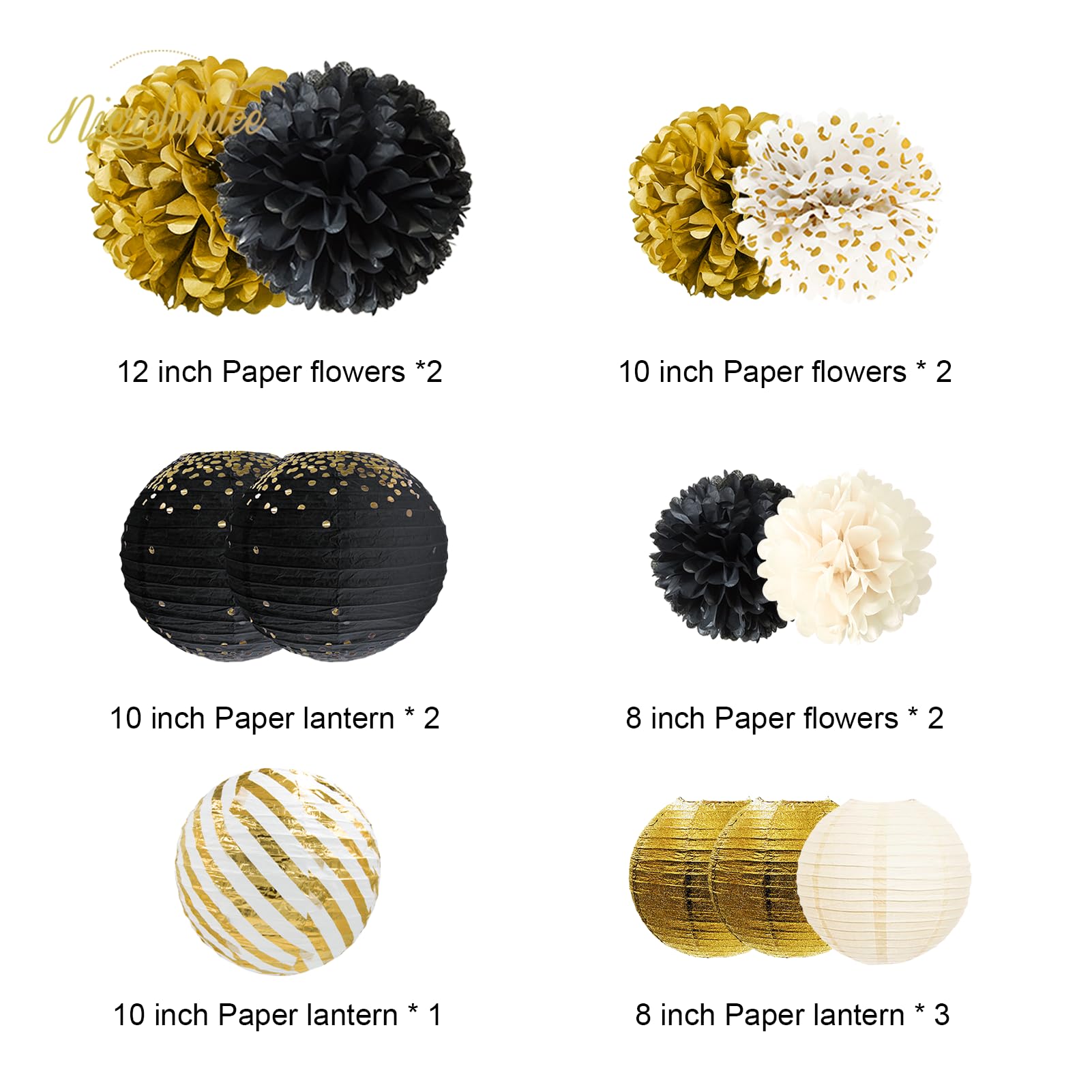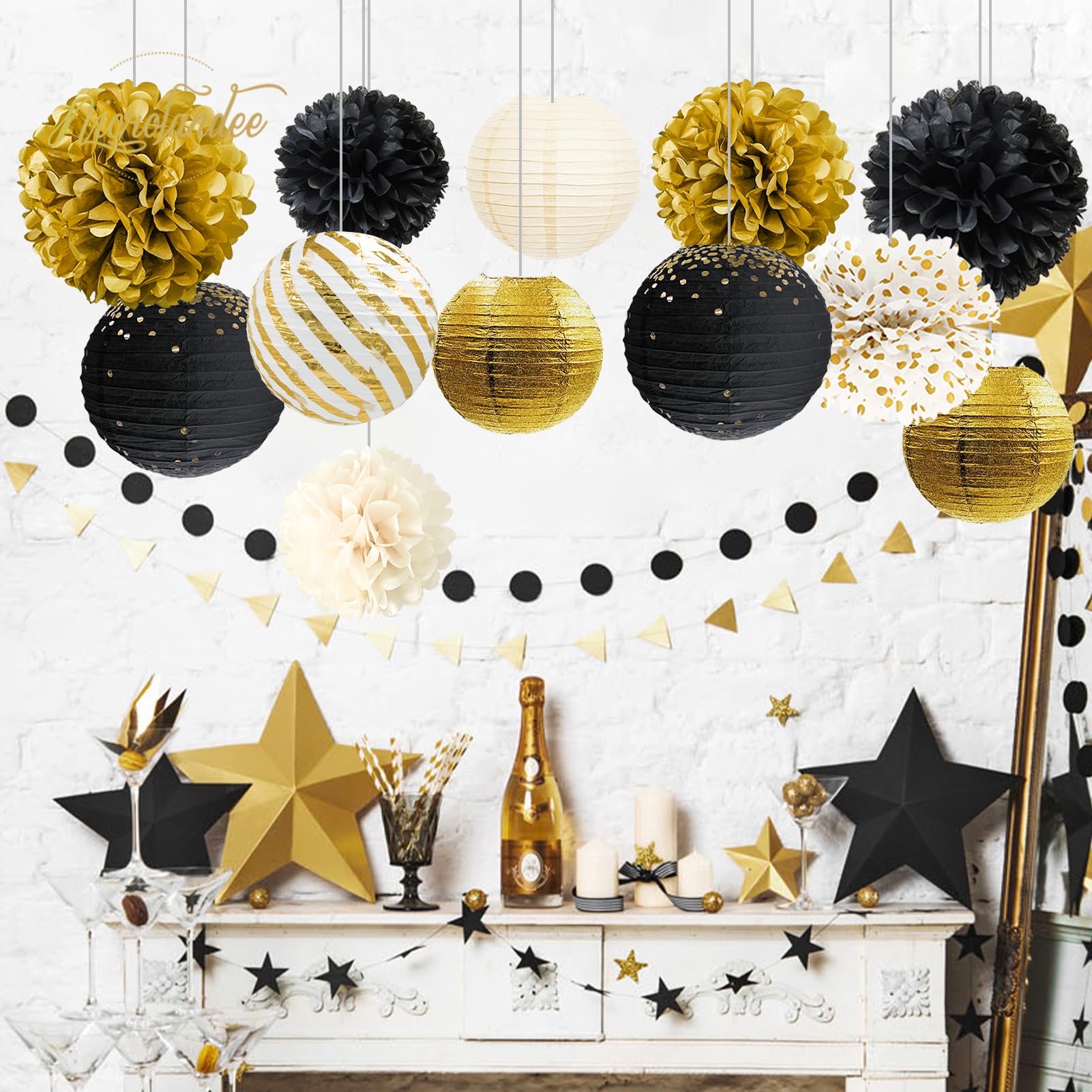 Package Includes: Black gold decoration sets come with 5 PCS tissue paper pom poms and 7 PCS paper lanterns. Total 12 PCS party decorations kits for black gold Theme Party