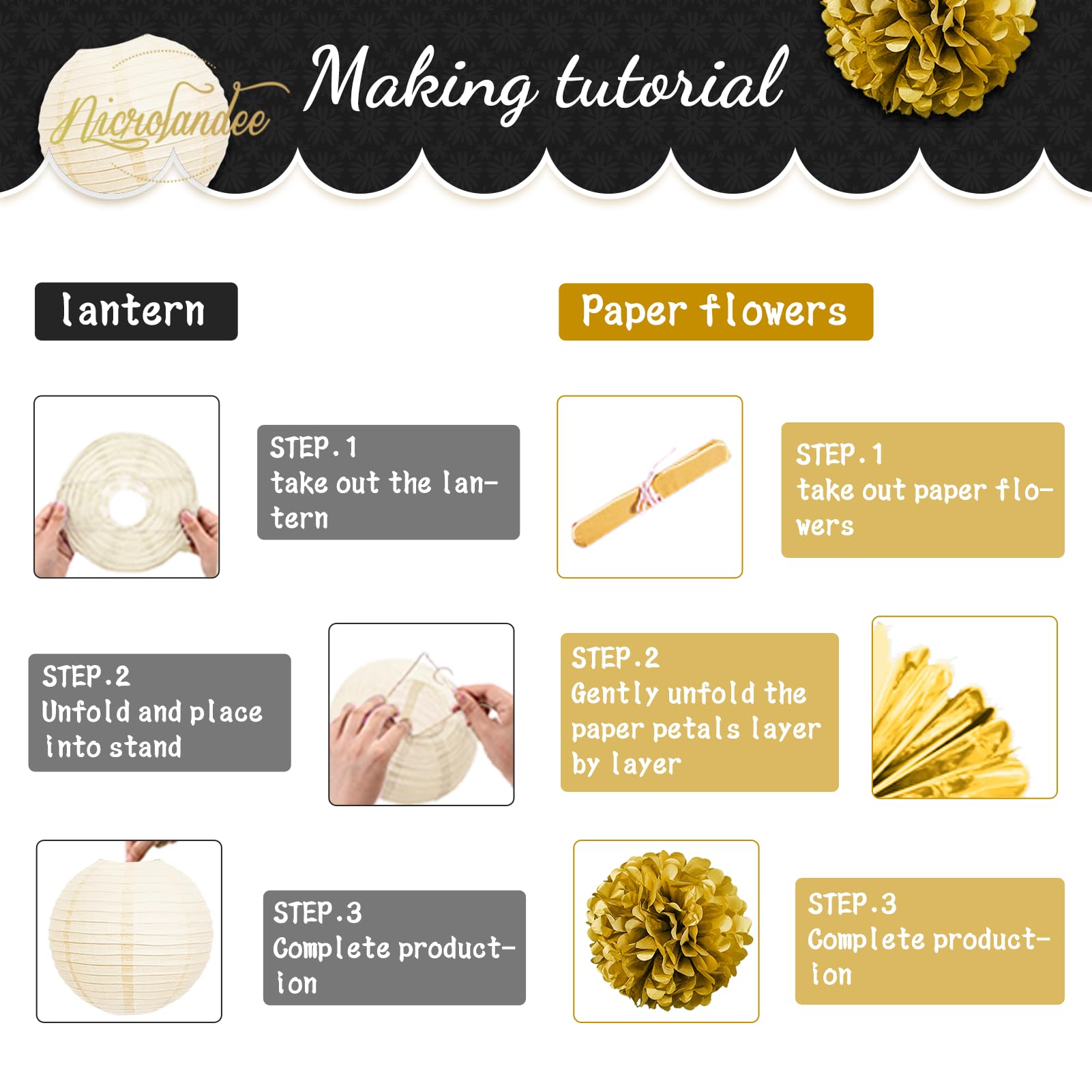 Classic Color: Paper lantern and pom pom set with 3 colors including black, gold and ivory to add more shades to your party! These black and gold background decorations are suitable for various themed weddings and birthday parties