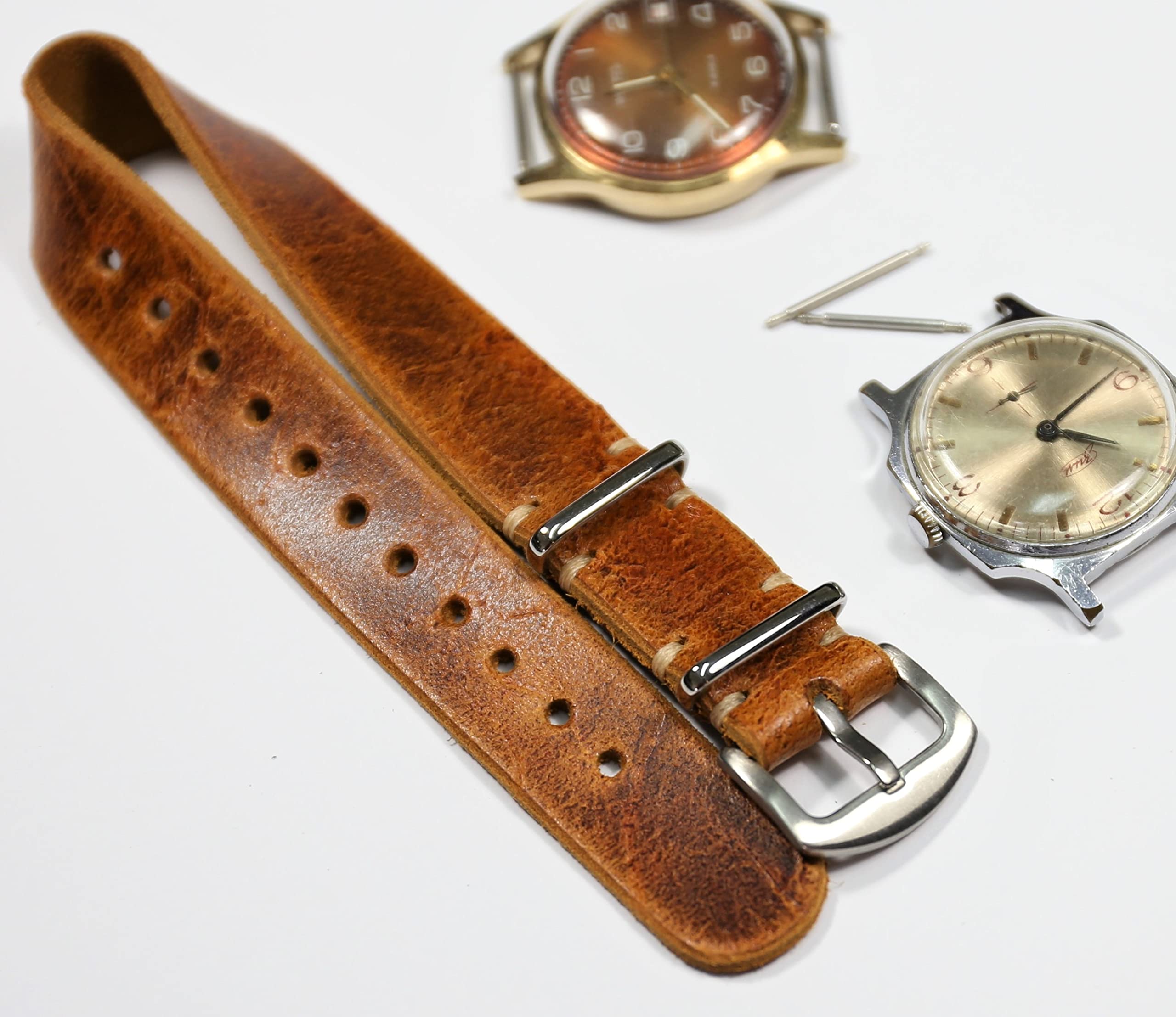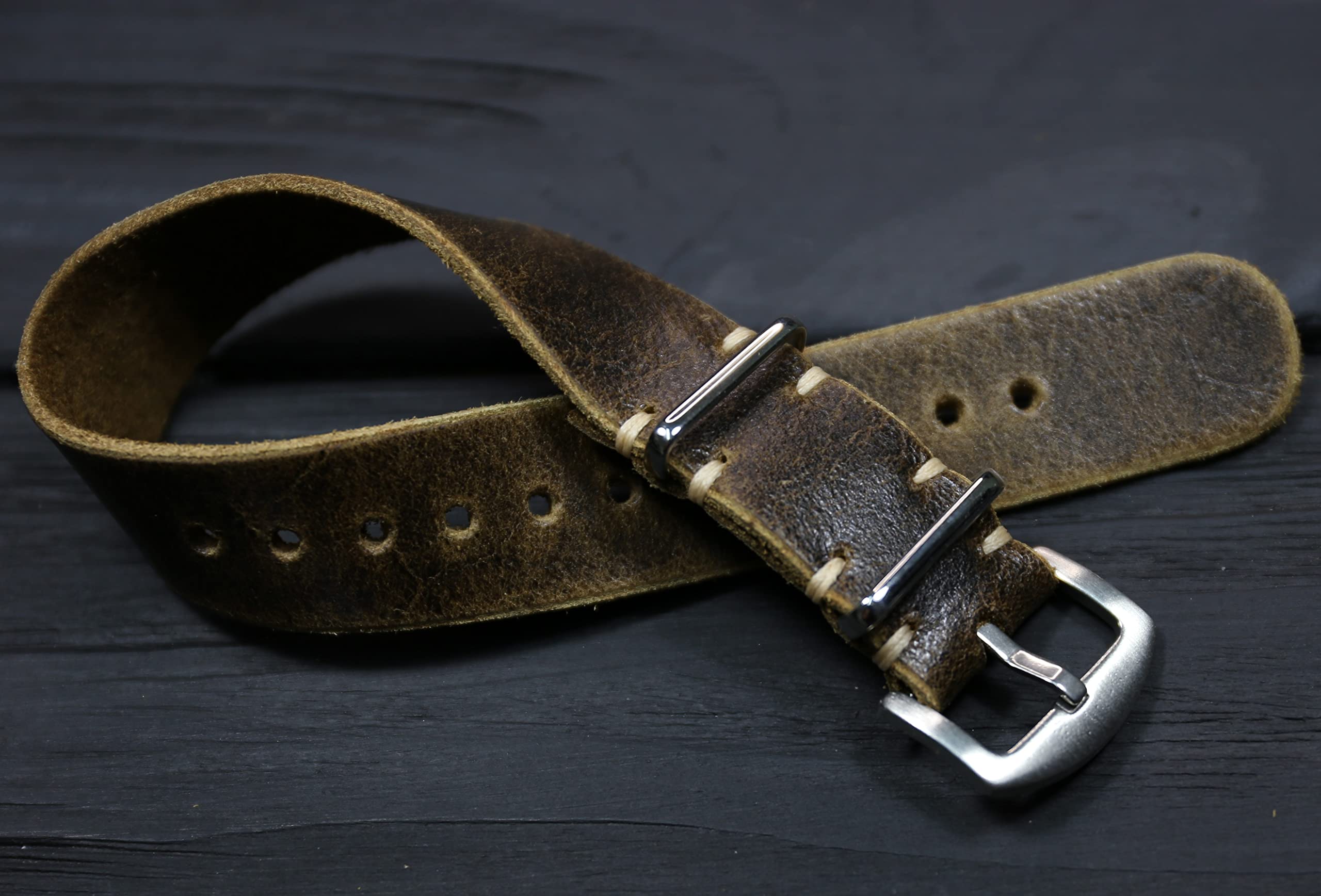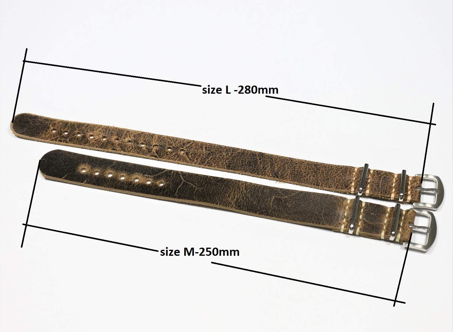 Description Watch straps from English luxury leather. A Single Pass band , Army style - Strap leather is carefully stitched with strong waxed beige thread made in Italy + stainless steel buckle . The bands are durable, soft and comfortable. This leather is produced by one of the oldest leather producers in England. In terms of its quality, when compared with a car, it will be a Mercedes. No one has ever been disappointed with a product made of this leather. LEATHER. Crazy Cow leather from the finest "Charles F Stead" tannery, UK HANDMADE. 100% crafted by hand from leather cutting to sewing by me COLOR: Brown and Dark brown. The color may slightly differ from photos due to your monitor settings. SPECIFICATION: Variation : strap size: 18mm, 20mm, 22mm, 24mm Rings: stainless steel rings Thread color: Beige Thickness: approx 1.9-2.00 mm !!! *Please message us if you are unsure what variation to take. STRAP LENGTH: size L - 280 mm , without buckle STRAP LENGTH: size M- 250 mm , without buckle *Please message us if you need assistance with your order! UNISEX. This strap can go with any watch (with a standard watch mount) you own and is a perfect fit for all genders. Best customized gift for those you care! Please don't hesitate to message us if you have any questions.