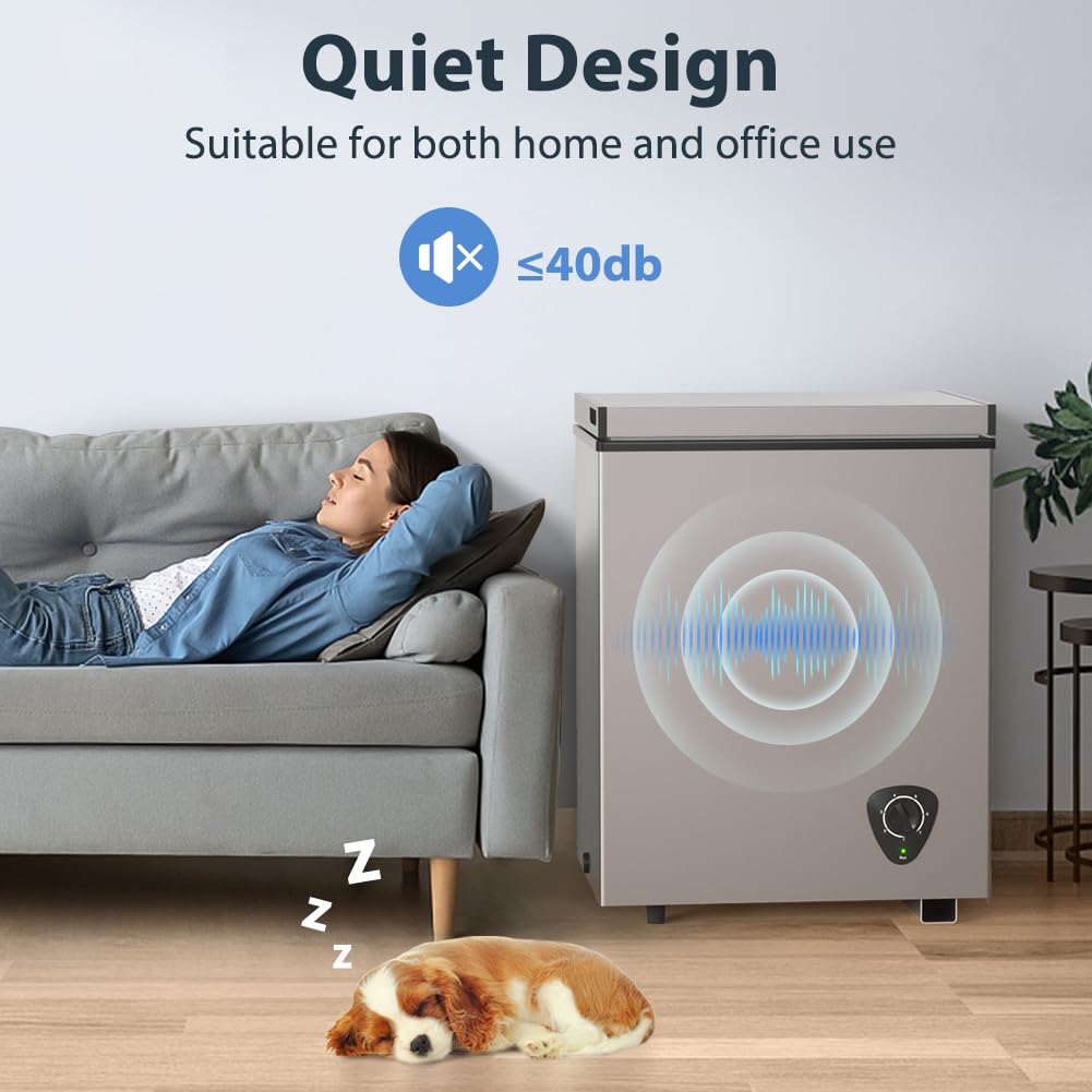 【Super Quiet】:This small chest freezer compressor runs very quietly when it is working. we specially deal with its noise so that the noise will not be louder than 40 db. Say goodbye to too much noise and heat to disturb your rest and work
