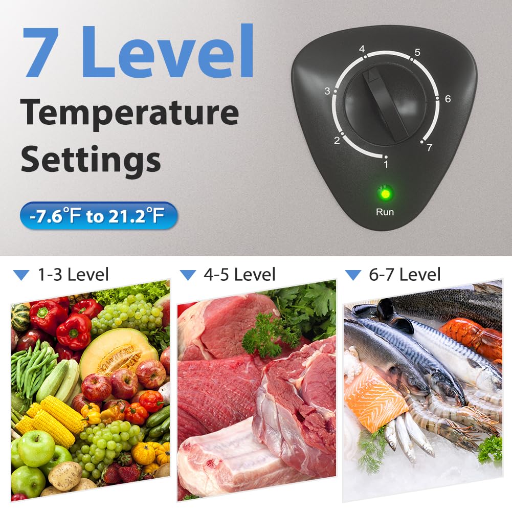 【Adjustable Thermostat Control】:7 Temperature Modes- The temperature can be changed from -7.6 to -22.2°F. No matter what you want, this small chest freezer can meet your needs. You can easily choose the most suitable low temperature environment for your food, which will keep it fresh for longer! The unit's power on (red) and run (green) lights show that it is operational