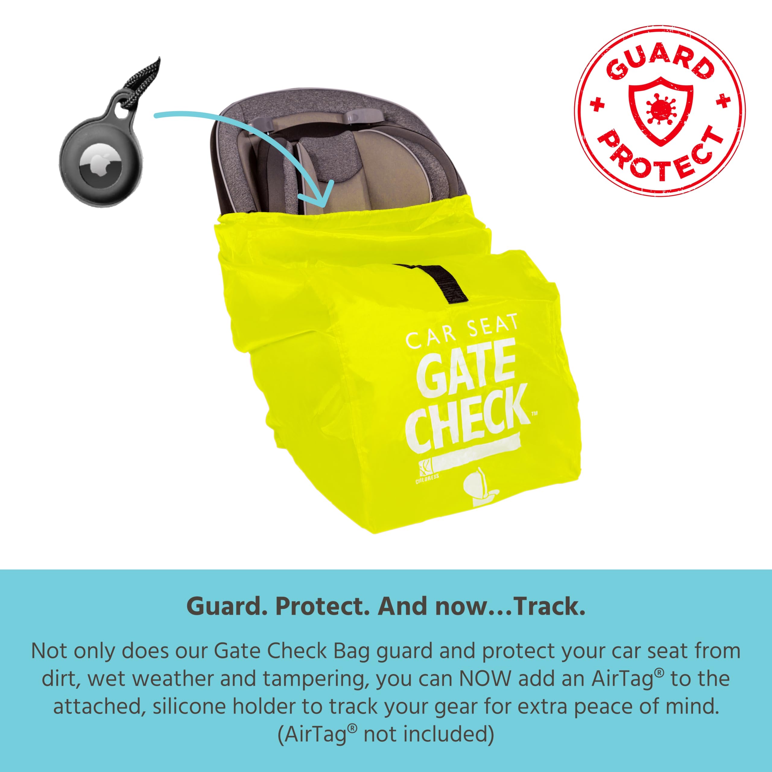 The J.L. Childress Gate Check Bag for Car Seats has been a go-to travel bag for parents for almost 20 years. Used by parents around the world, this lightweight bag will protect your child’s car seat from dirt and damage when checked at the airline gate. The universal size fits all types and sizes of baby and child car seats. NEW FEATURE: The interior of the bag features a silicone Apple AirTag holder so you can track the location of your bag during travel (AirTag not included). A lockable draw-string closure, carry handle, and reinforced seams are designed to make traveling a bit easier and provide you with peace of mind knowing your car seat is well protected. The attached stretch pouch makes unfolding and refolding the bag quick and easy. The large ID box for your name helps to quickly identify your car seat. The durable fabric and large GATE CHECK logo help ensure that your car seat is protected and safely returned to you at the end of your flight. You pack the snacks…we’ve got the car seat covered! AIRLINE APPROVED and recommended by baggage handlers around the world. Trust J.L. Childress, the original inventor of the stroller and car seat Gate Check Bags. Around the world or around the block, Travel Happy with J.L. Childress!