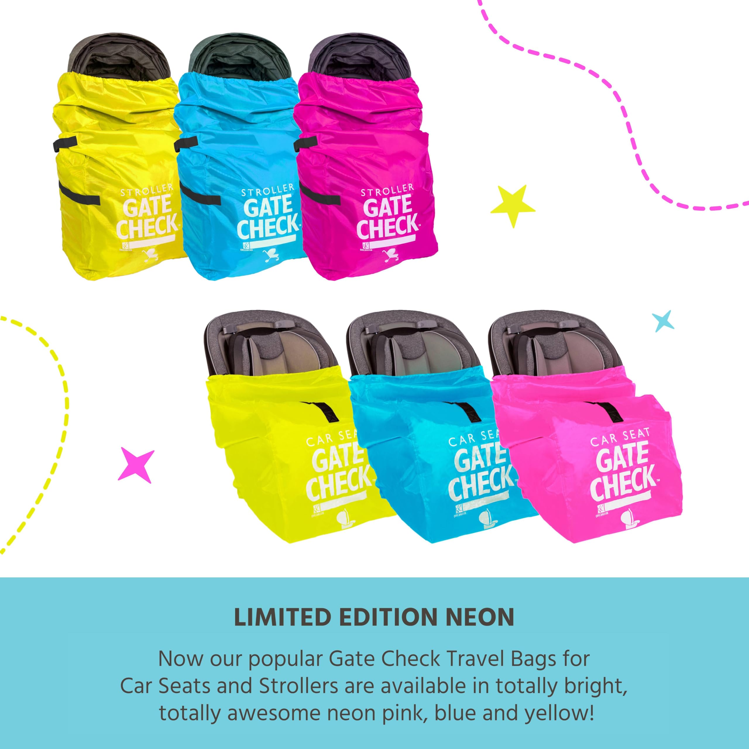 NEW LIMITED EDITION NEON: We design our Gate Check Bags in bright colors with our signature, large GATE CHECK logo to provide you with peace of mind that your car seat can be easily identified and returned to you at the airplane gate. ID box to write name. Webbing handle for easy lifting. NOT RECOMMENDED FOR BAGGAGE CHECK