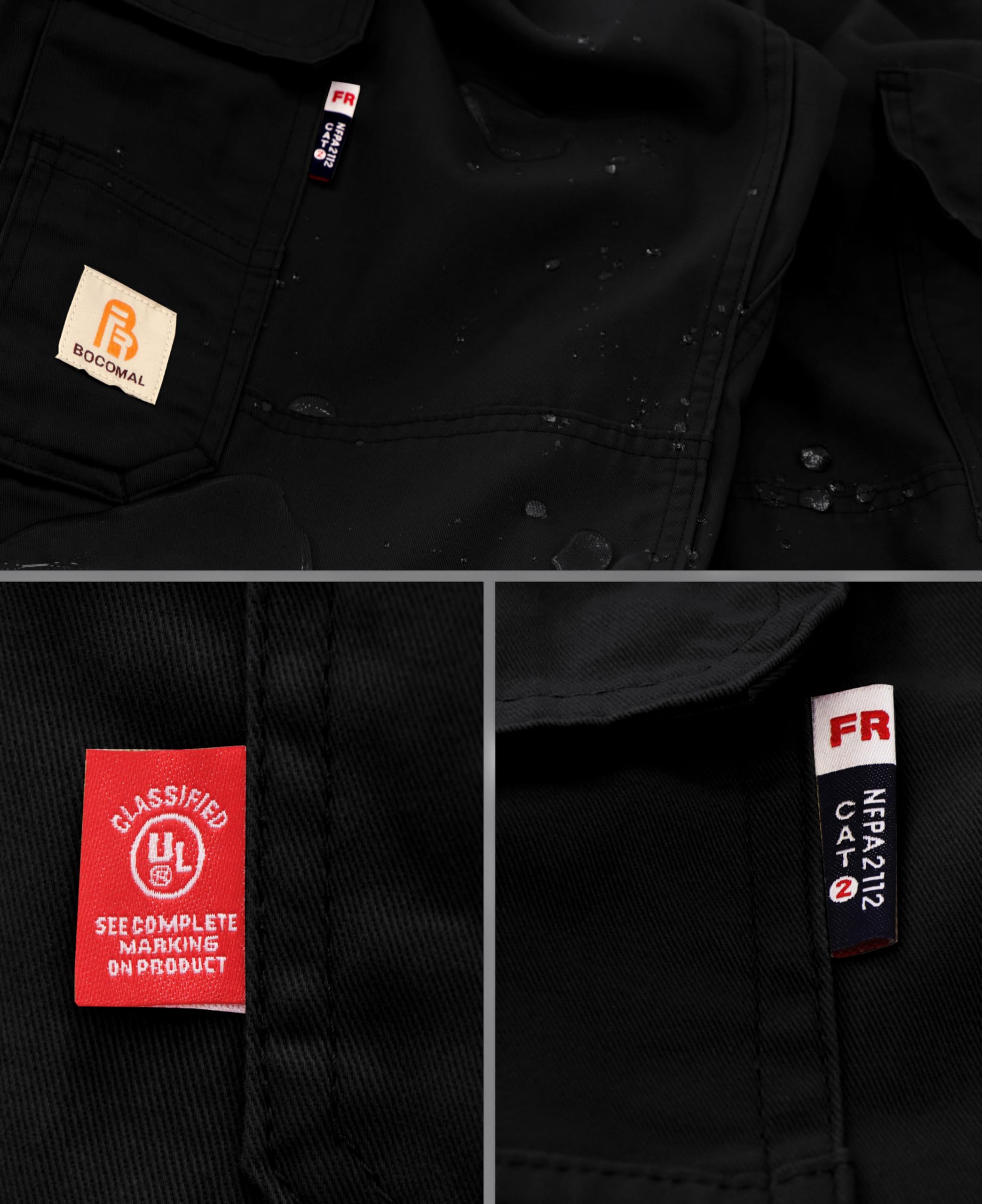 Functional FR MATRIALS:Water & Oil Repellent Finish.7.5OZ Mid-weight Cotton Twill Flame Resistant Treated,FR Buttons,FR Sewing Threads!Clear FR Tag on front.UL NFPA2112 Classifeid,More FR info On Wash Tag About UL Certification.We Attached A Small Sample Inside Package For Cunstomers Simple FR Try