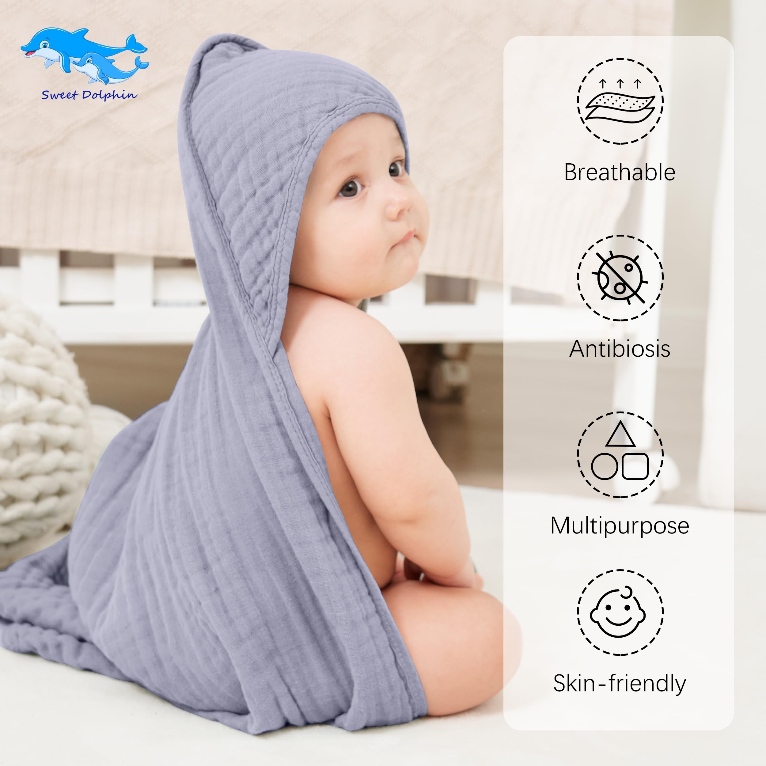SWEET DOLPHIN Muslin Hooded Baby Bath Towels - 2 Pack 100% Cotton Towel for Babies, Infants, Toddlers - 32x32Inch - Highly Absorbent and Newborn Essential, Grey