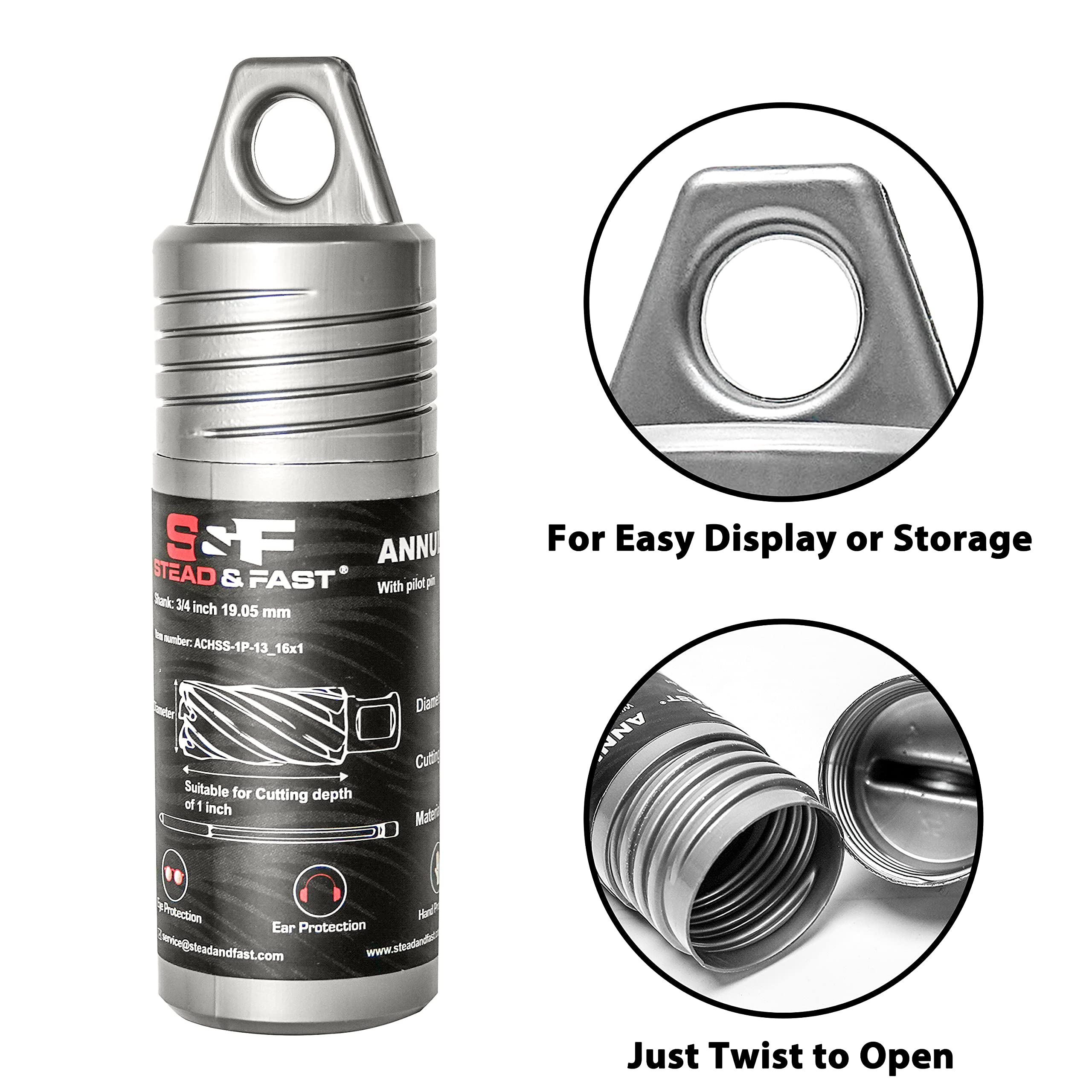 Sturdy plastic case holding one annular cutter, one pilot pin