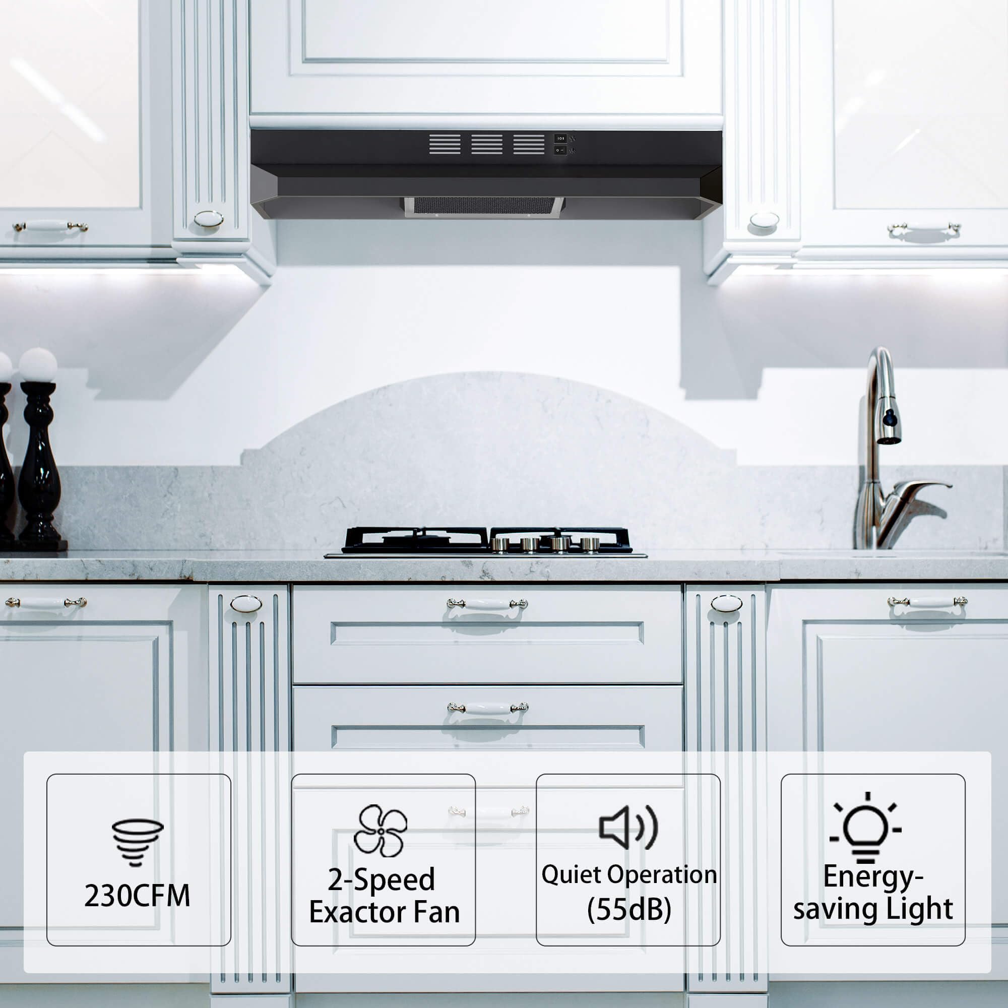 【MODERATE SUCTION POWER】: With a 230 CFM Airflow, the SNDOAS Cabinet Range Hood delivers moderate ventilation performance that is suitable for single apartments or small households that require efficient air filtration.