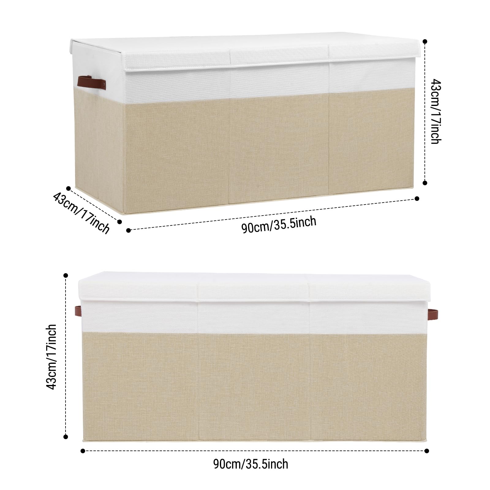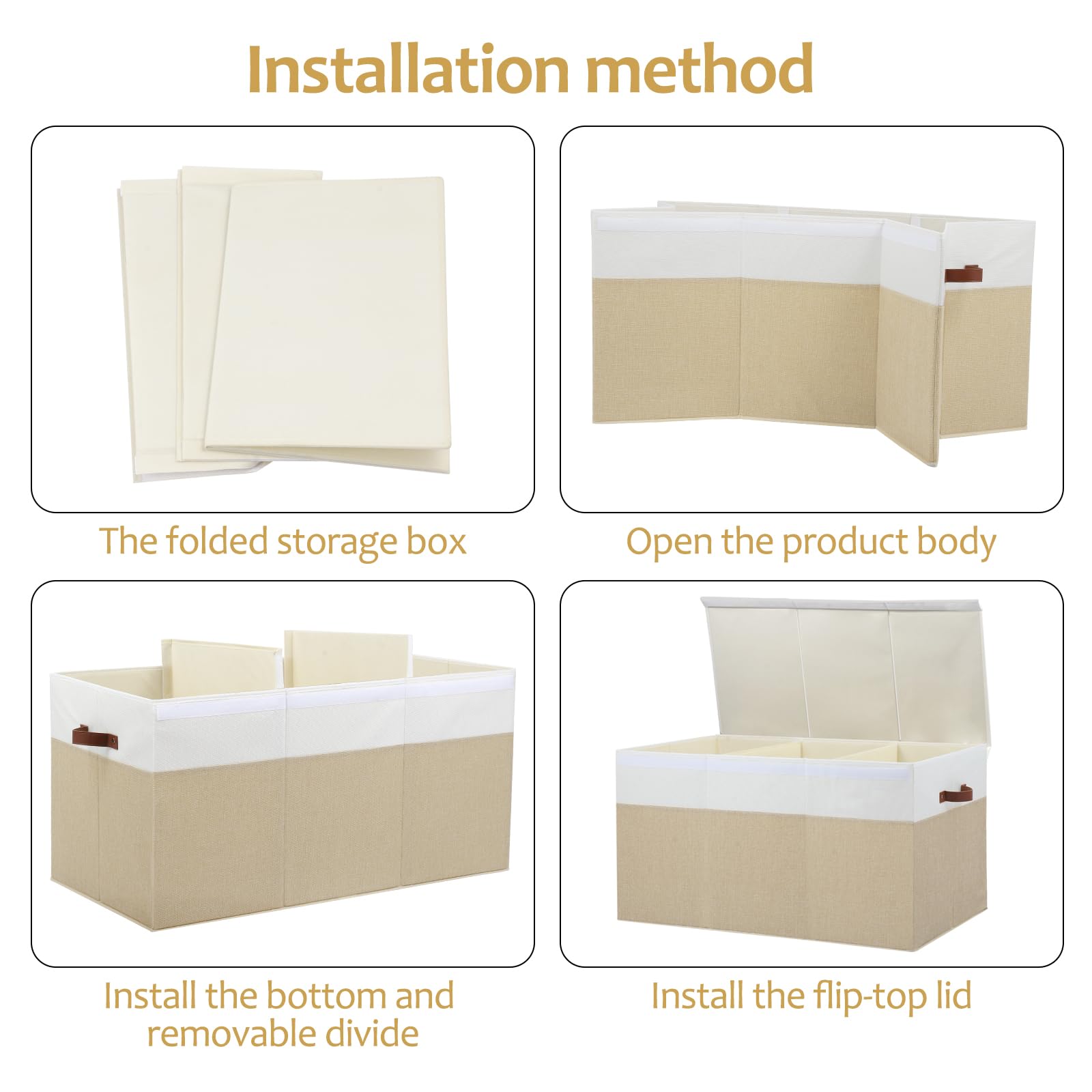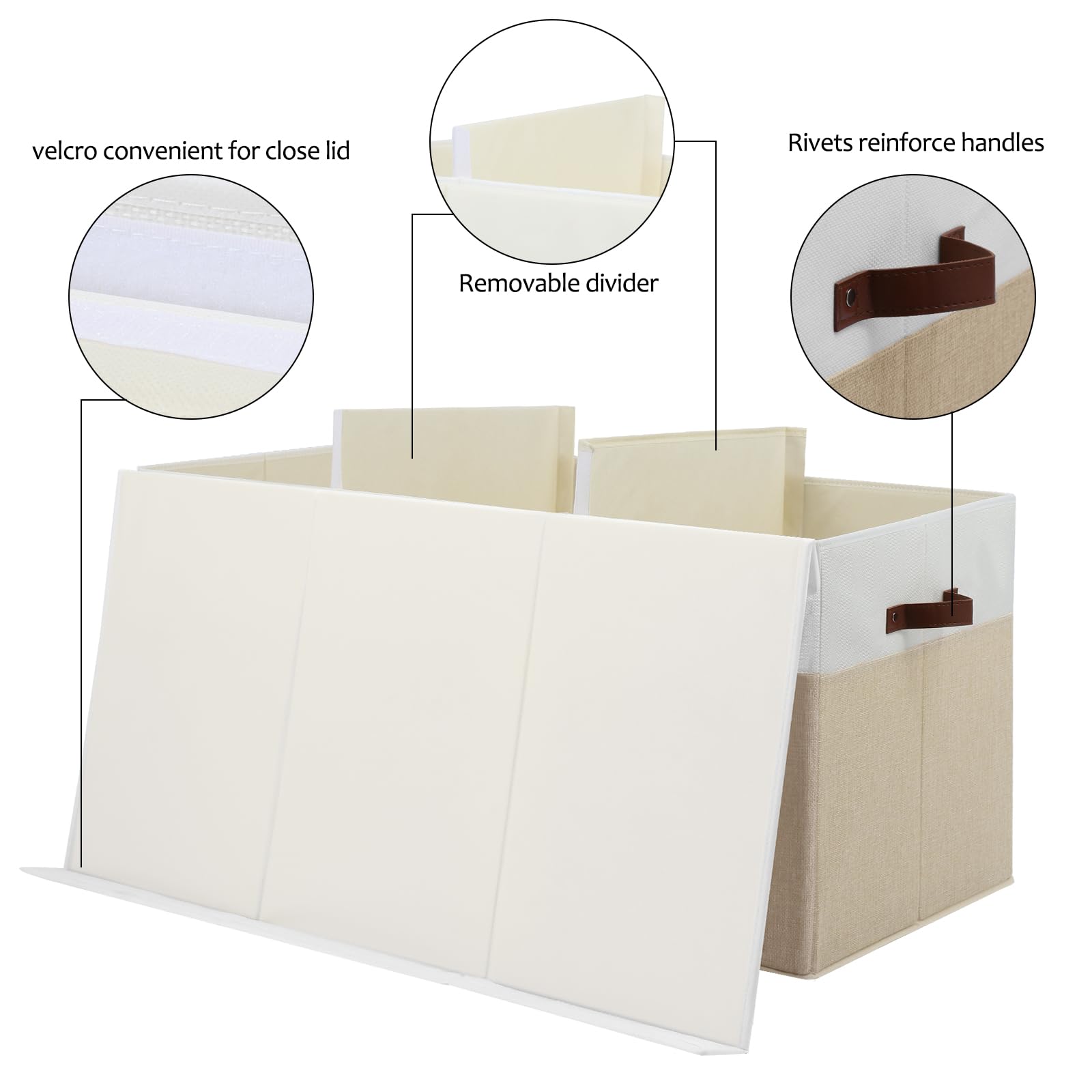 ADVANTAGES: Removable divider board : Great for organizing different items, you can detach the divider for store bigger things Flip-top lid : Keep your items away from dust, open the lid can also be used as an open box Rivets Reinforcement Handles : you can easily carry the large storage basket around your home Collapsible : When not in use, allowing you fold it flat, easy store or carrying Stackable : The toy boxes has a sturdy top, bottom and side, you can stack them SPECIFICATIONS: Color: Beige&white External material: Polyester linen Upholstery Material: Non-woven fabric Construction Material: 3mm high-quality strong PP board Product Size: 35.5"x17" x17" MULTI-PURPOSES: Closet clothes storage Bathroom sundry storage Shelf organizers Car / vehicle grocery containers Nursery toy storage Bedroom comforters, blankets storage Kitchen & pantry snacks and dry foods storage Office document storage Laundry room cleaning supplies storage ABOUT OUR SERVICES If for any reason you're not completely happy with your purchase, please reach out and we will resolve issues and ensure your contentment.