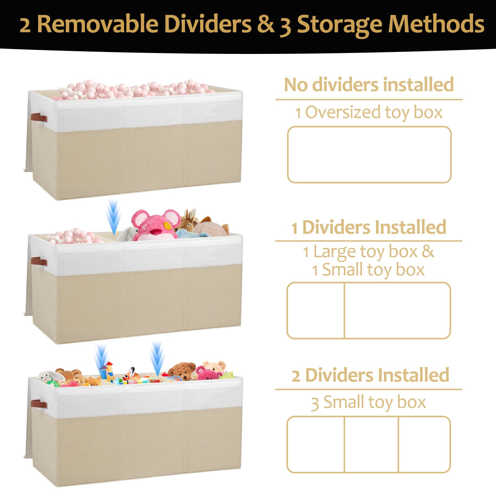 DETACHABLE DIVIDER - The toy box have 2 removable divider board. You can attach it by velcro, which is great for organizing different items separately, you can detach the divider for store bigger things, like blankets, large toys, etc