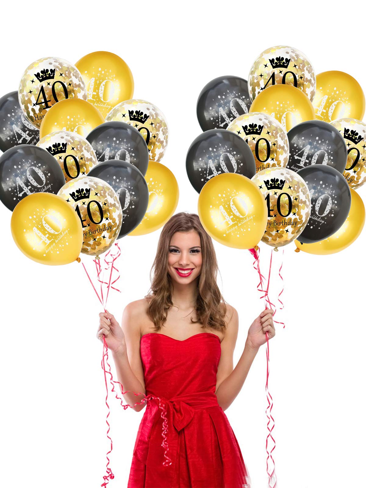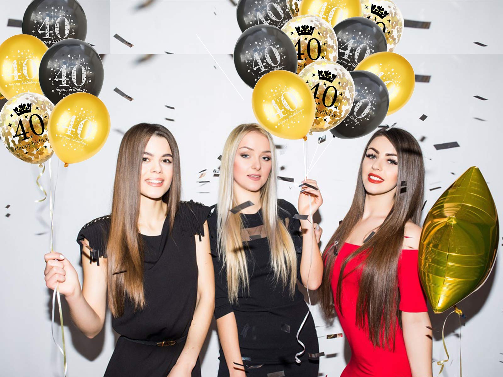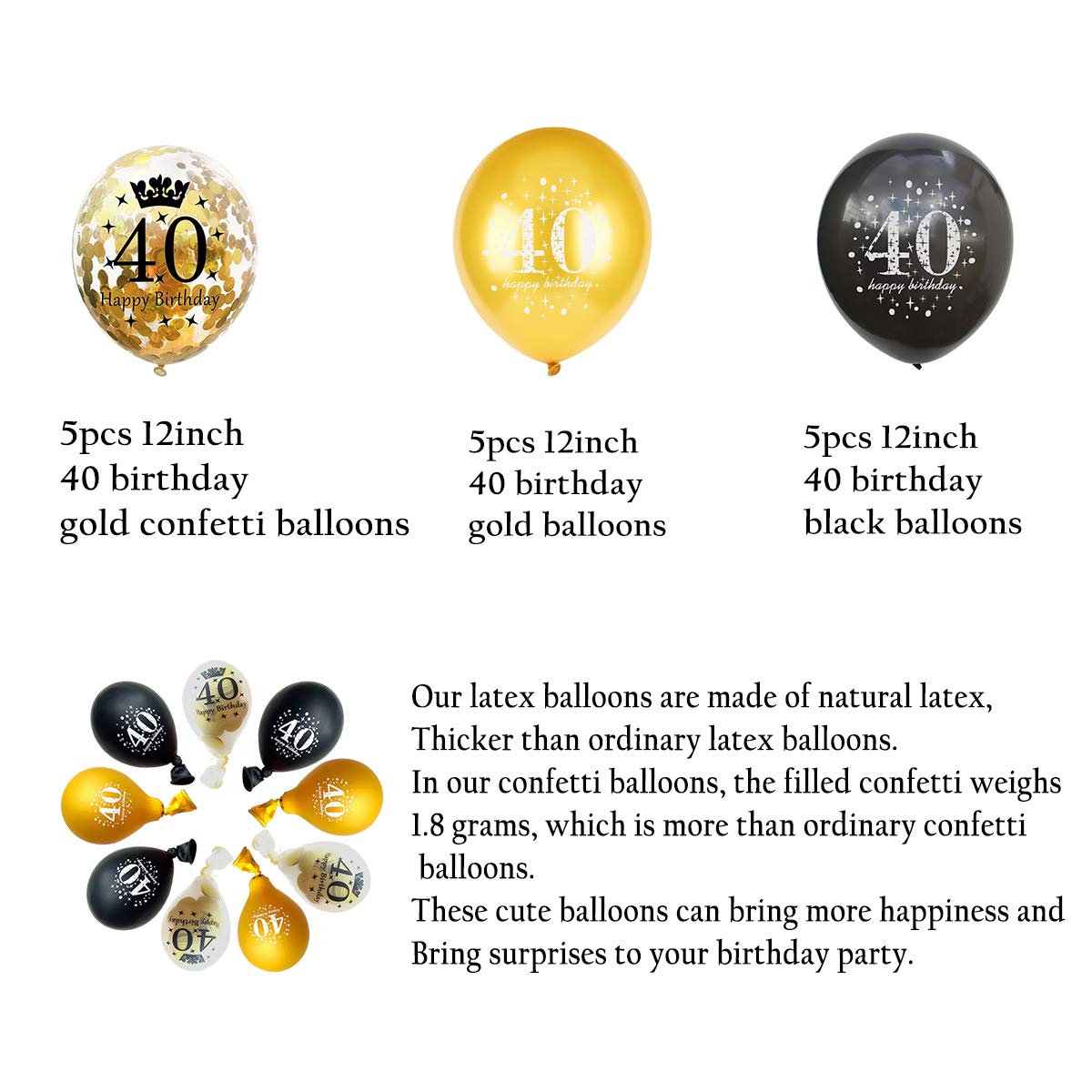 3 COLOR DESIGNS:5 pieces 12 inch black latex balloon printed"40 Happy Birthday"+ 5 pieces 12 inch gold latex balloon printed"40 Happy Birthday"+5 piece 12 inch gold confetti balloons. These gold,black and gold confetti balloons will create a joyous atmosphere and leave unforgettable memories for you and your party guests.