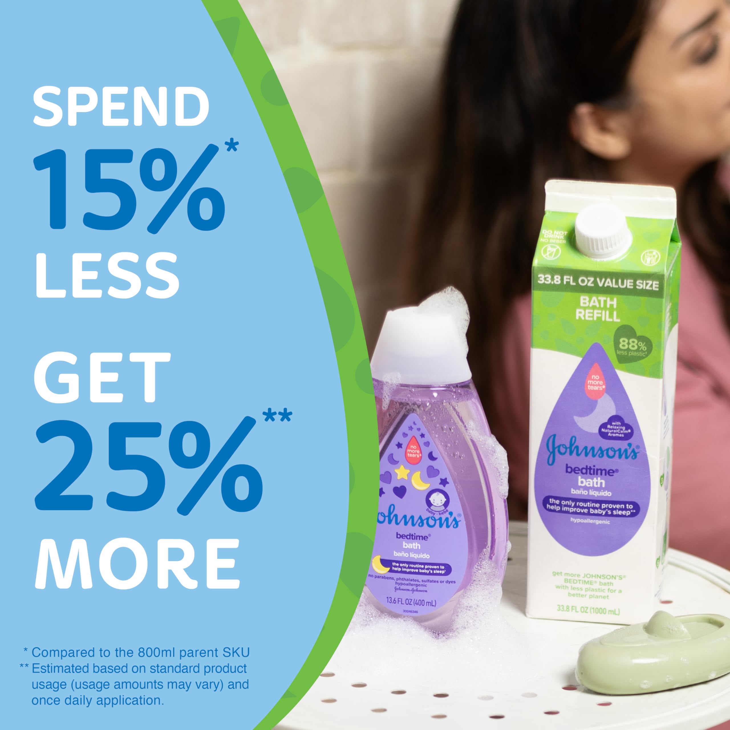 Same great Johnson's Bedtime Baby Bath with a new paper-based carton packaging that has 88% less plastic* & is recyclable *vs 2x400 mL bottles of Johnson's Baby Shampoo including cap & label
