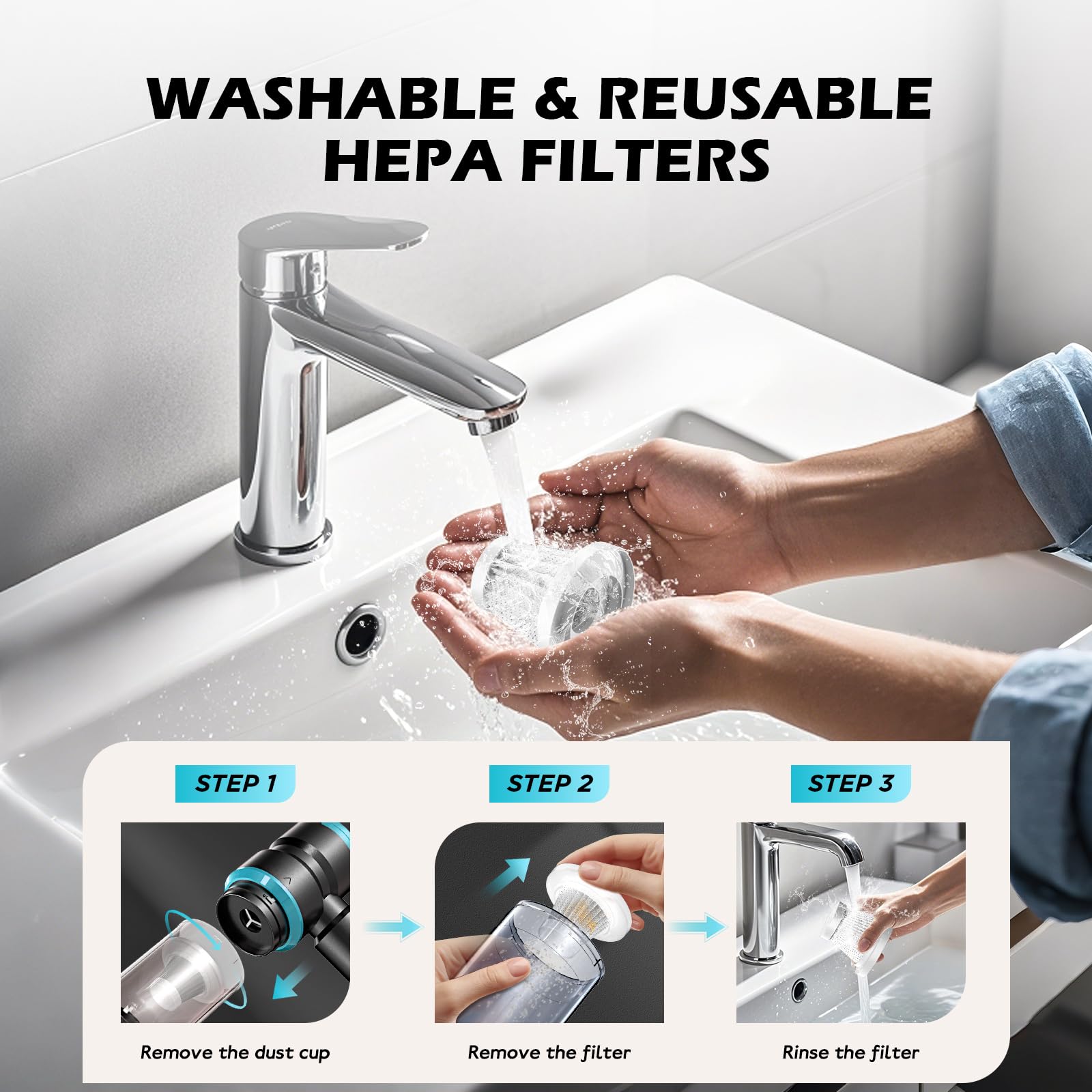 2 Washable & Reusable HEPA Filters:The cordless portable car mini vacuum includes 2 HEPA filters, which ensures cleaning by effectively trapping dust and particles. The filter is washable and reusable, allowing for long-term use and easy maintenance.Important: Always install the filter before use to prevent debris from entering the vacuum and causing damage