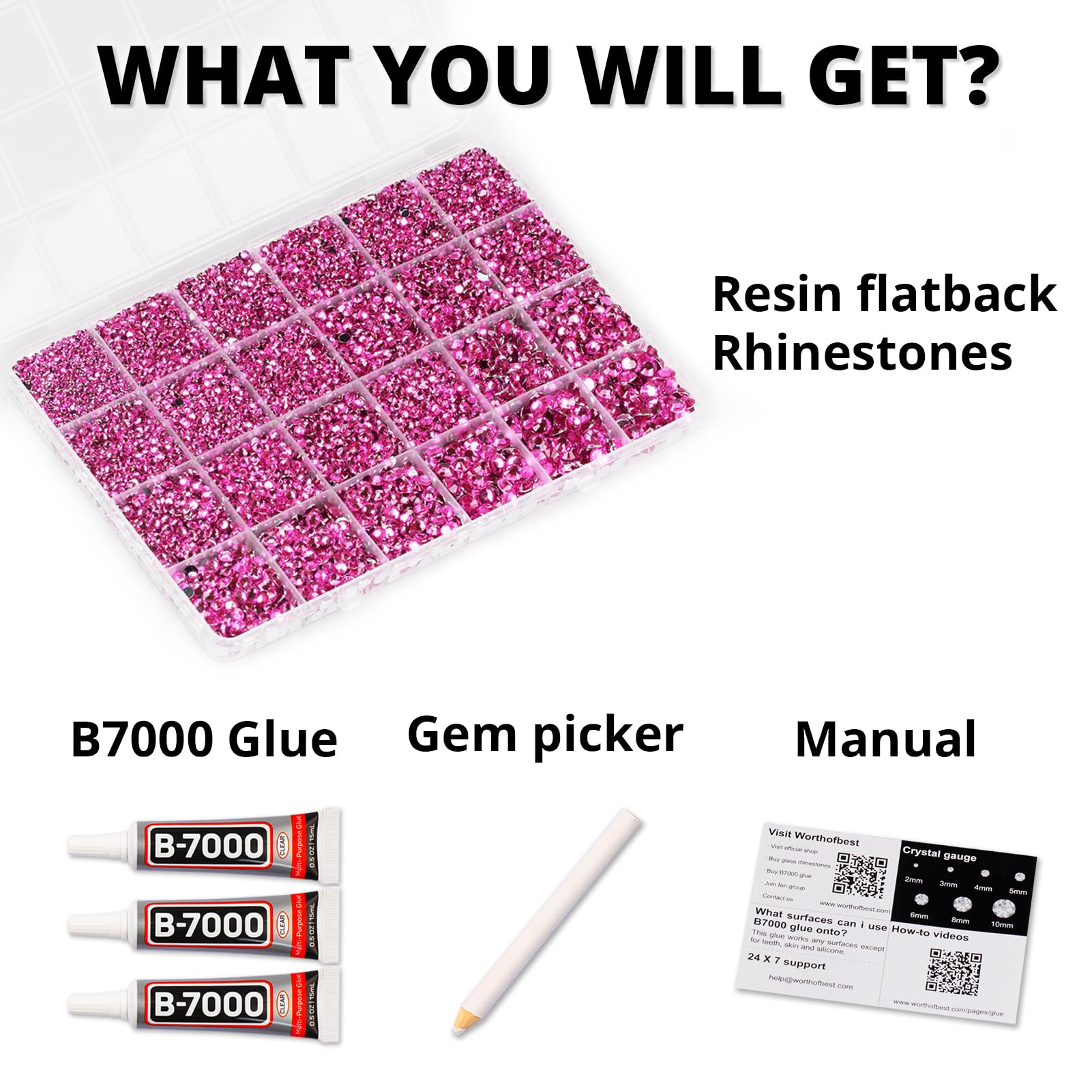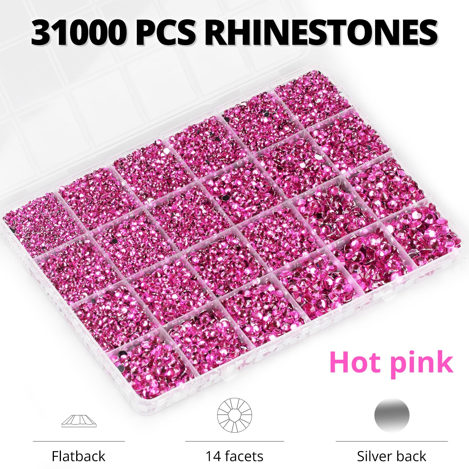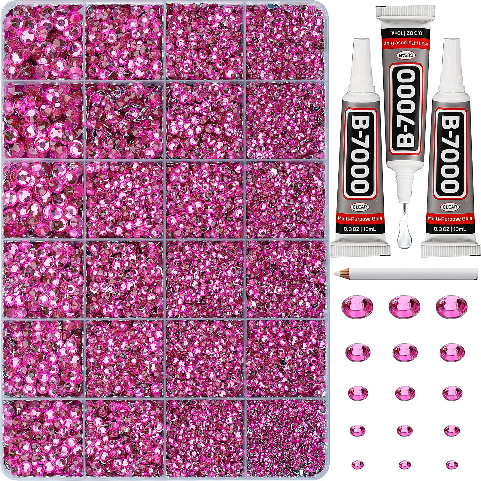 Package Content with Tool (pickup pen and manual) -- The bedazzler kit Package includes 1 hot pink dark pink fuchsia rinestones set with 24 grids, approx. 31000 pcs of 2-6mm bling-out resin rhinestones