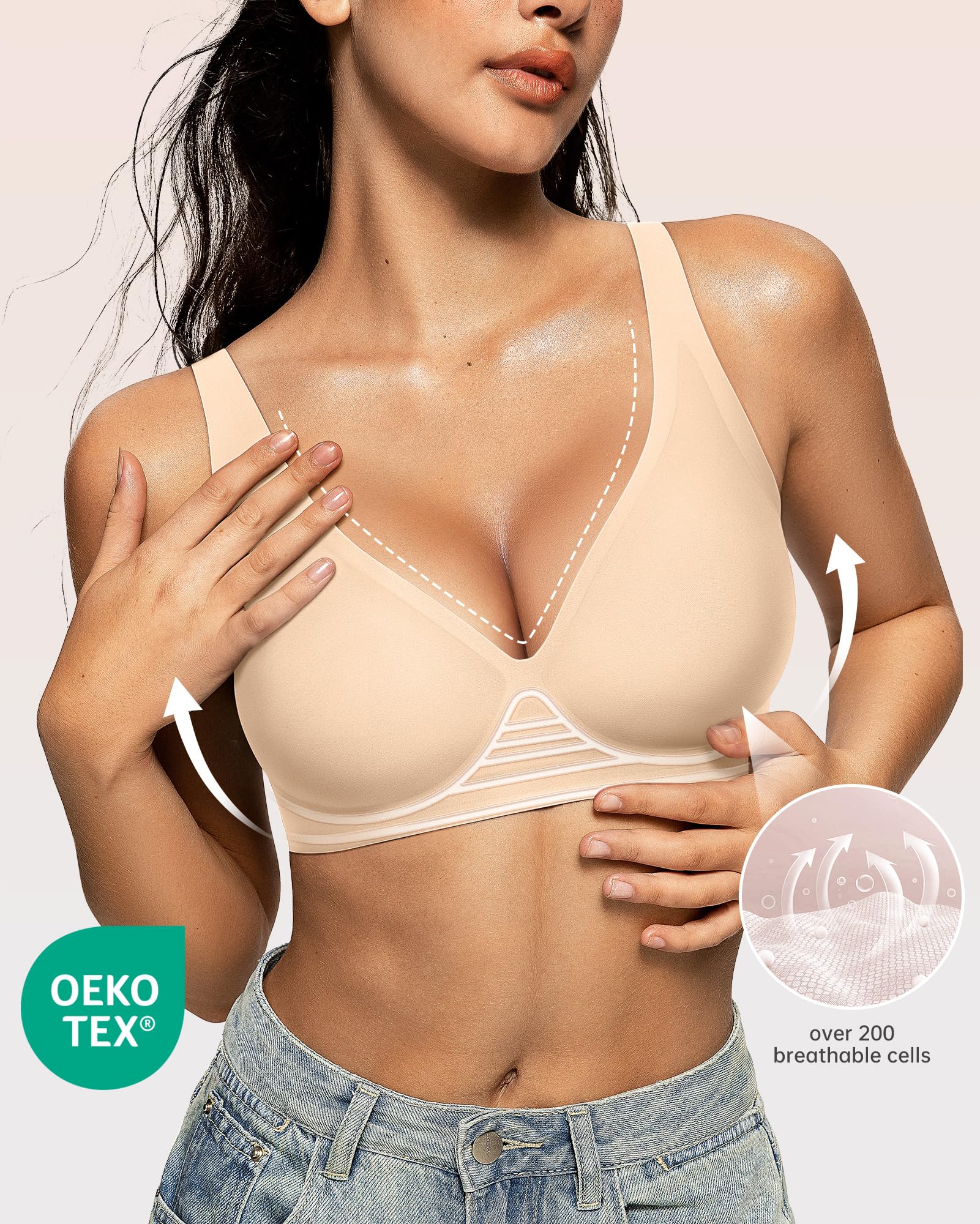 Ultra Soft and Comfortable Bras - These deep V bras with semi-fixed pads are made from high-quality fabric with a delicate texture, super breathable and gentle on the skin, providing a feather-light feeling with zero pressure. The highly stretchy design fits perfectly under your chest curve, effectively preventing the bra from slipping when lift your hands. Each semi-fixed pad has over 200 breathable holes, keeping you cool and comfortable for 24 hours.