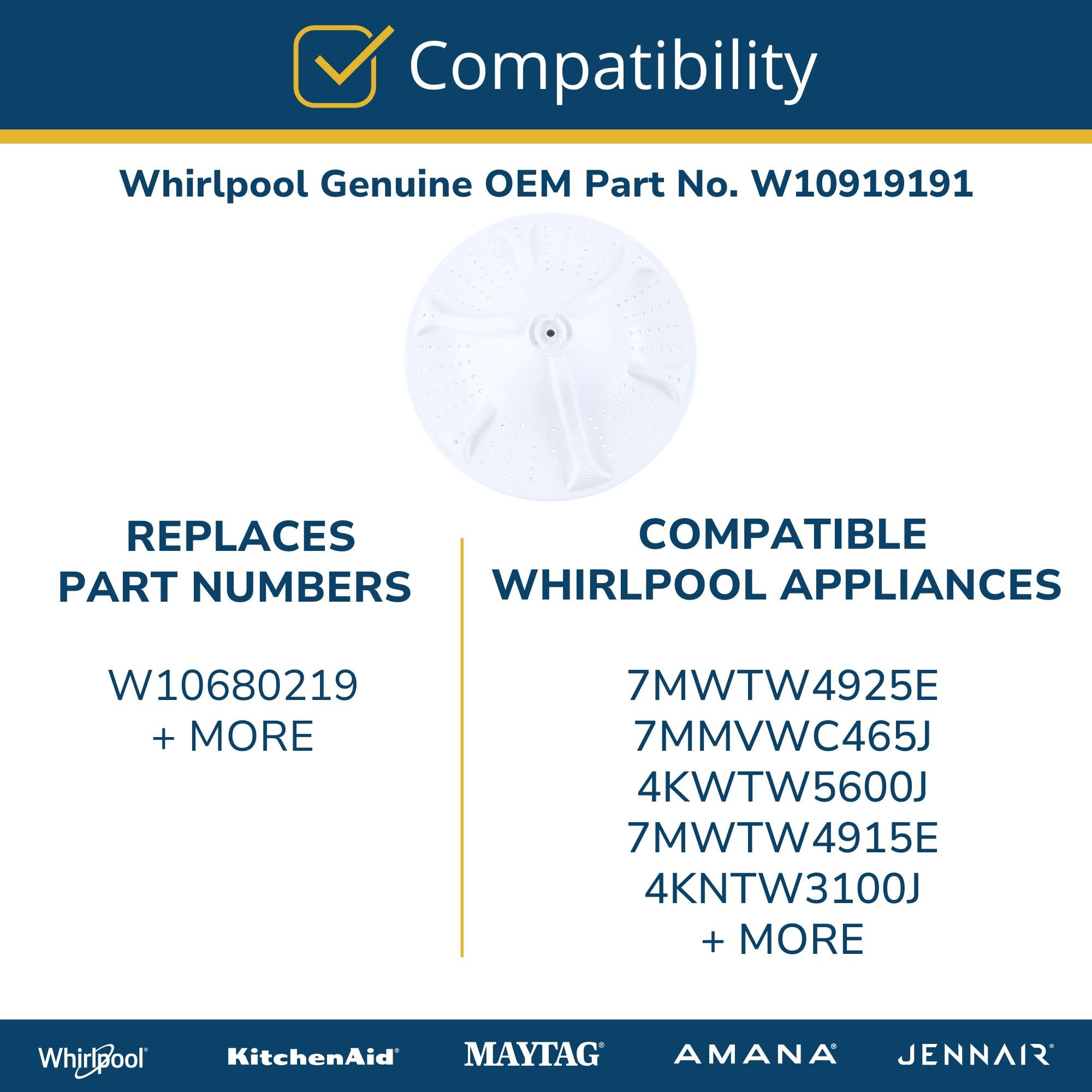 COMPATIBLE APPLIANCES: W10919191 is compatible with 7MWTW4925E, 7MMVWC465J, 4KWTW5600J, 7MWTW4915E, and 4KNTW3100J
