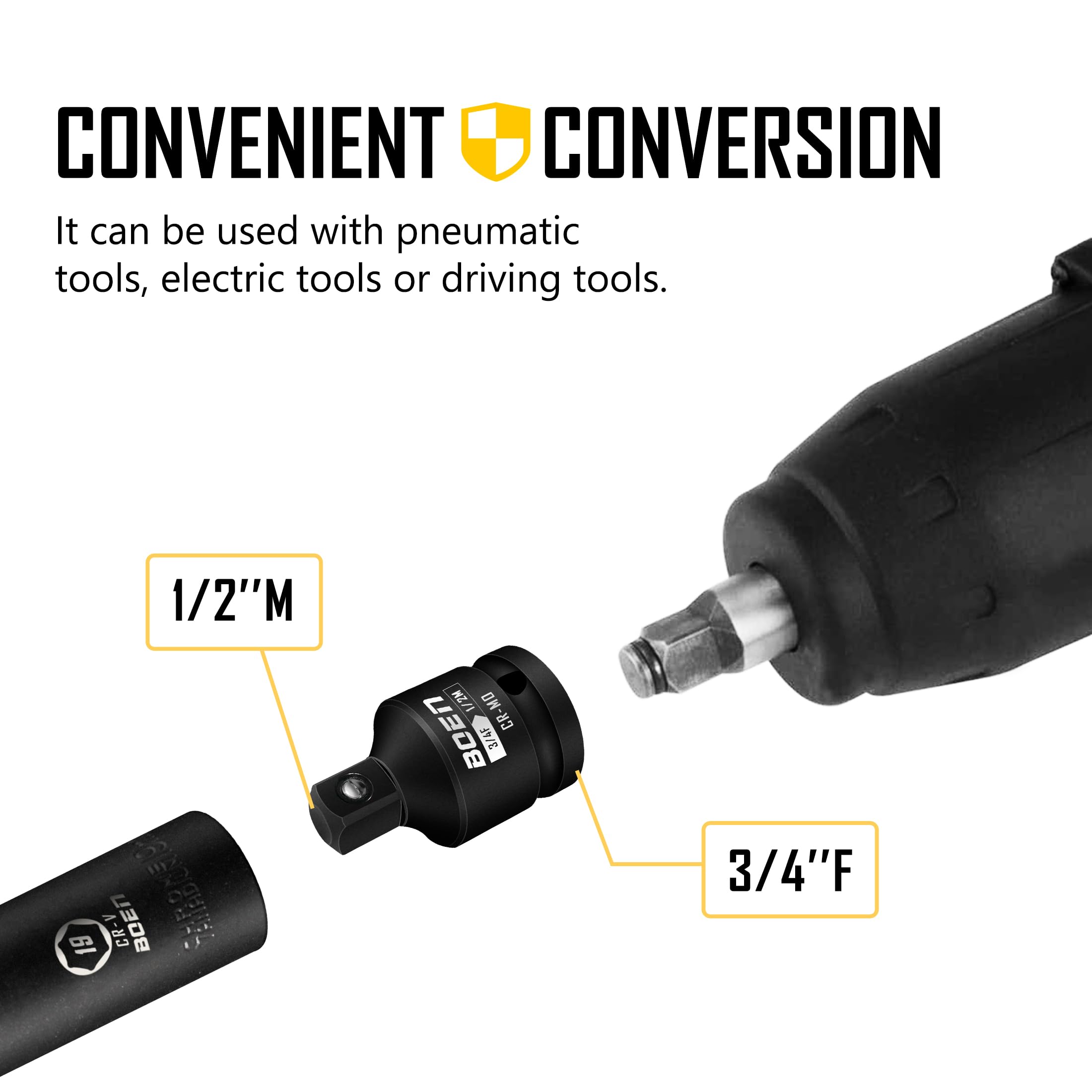 【WIDE APPLICABILITY】 Complete impact drive socket adapter set, with convenient conversion and strong compatibility, can meet all your needs. Designed for drivers, wrenches and ratchets. It can be used with pneumatic tools, electric tools or driving tools.