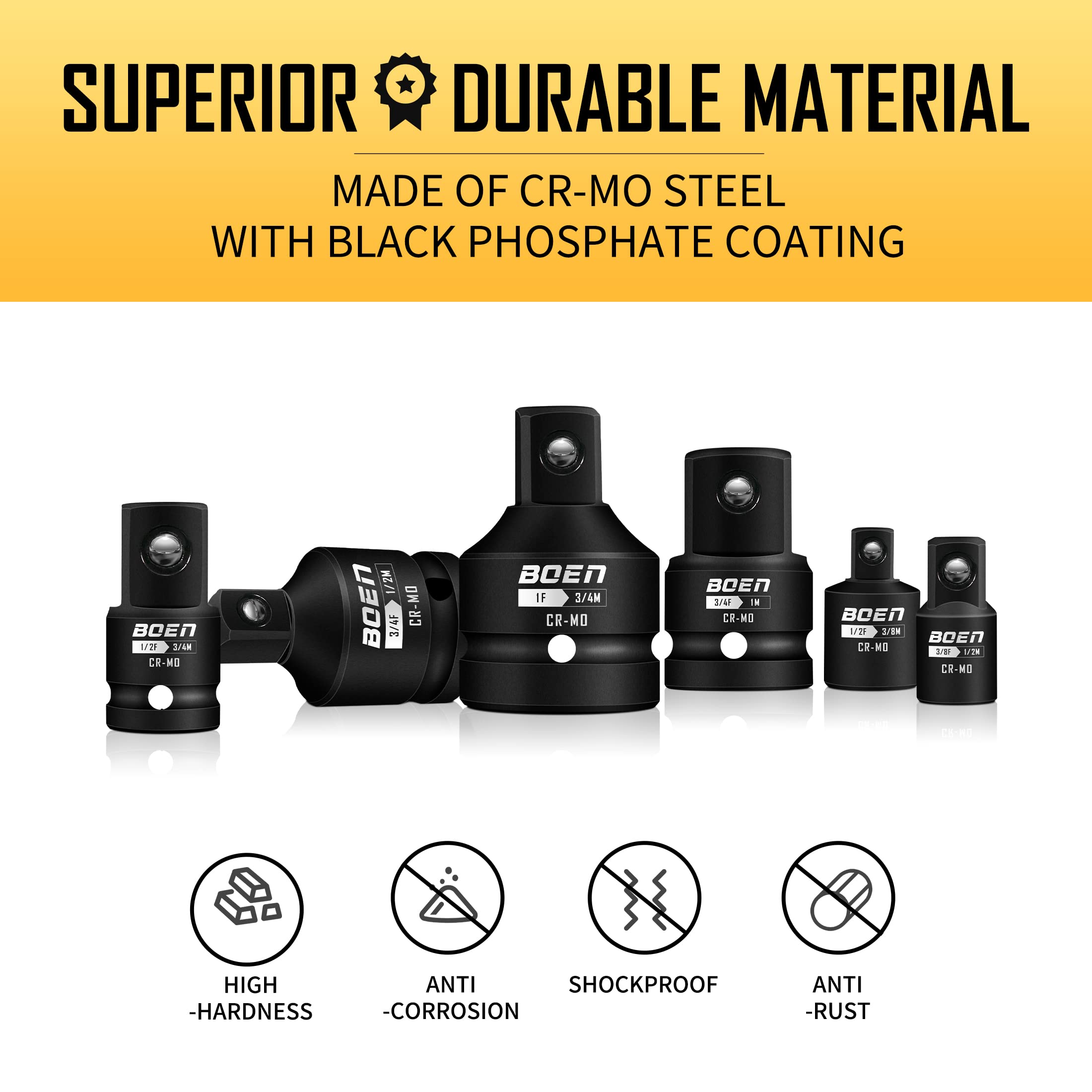 【SUPERIOR CR-MO STEEL】 Constructed with heat-treated forged chrome molybdenum steel material, BOEN impact adapter set features high hardness and durability, and can withstand the test of different jobs.