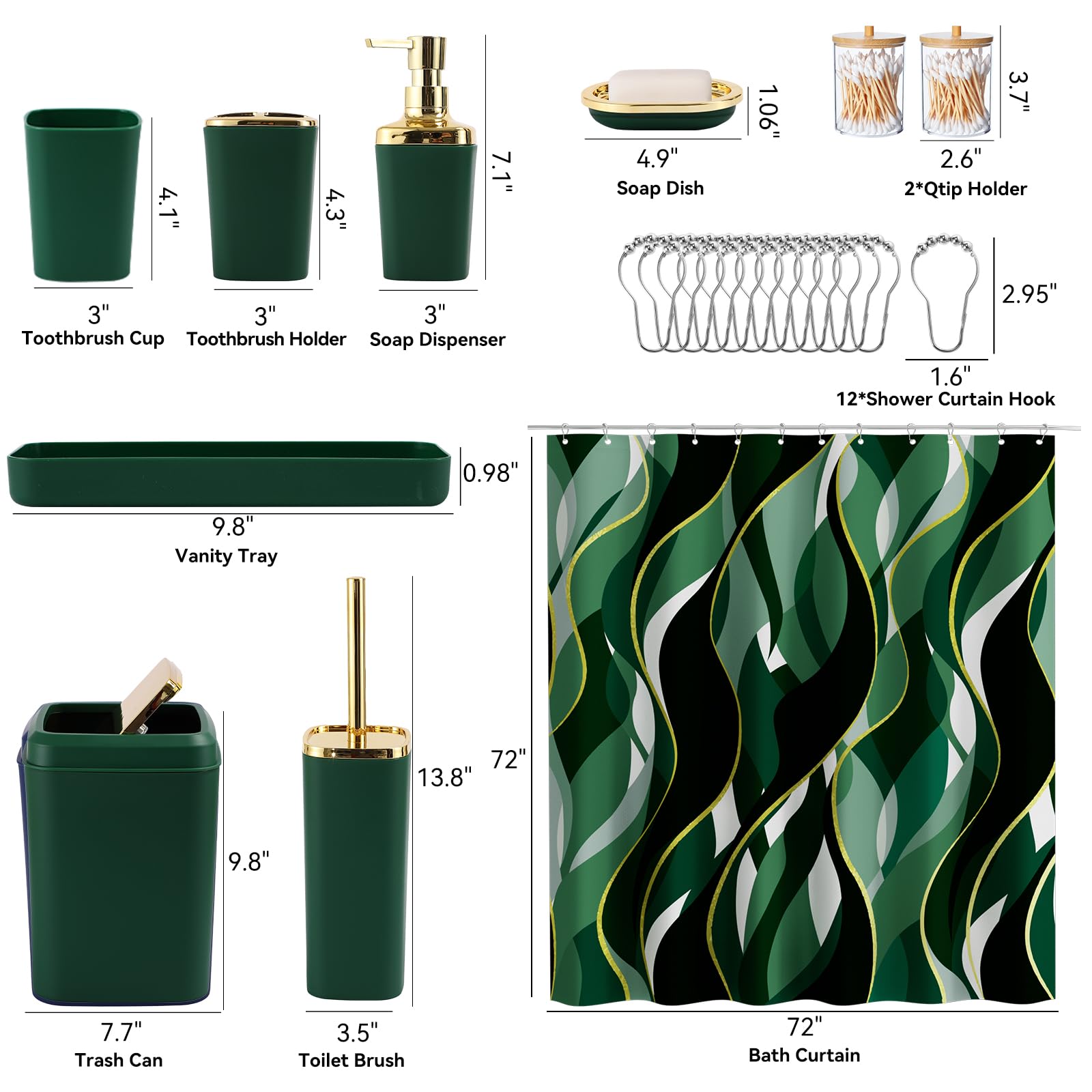ใ๐๐๐ญ๐ก๐ซ๐จ๐จ๐ฆ ๐๐๐ญ๐ฌ ๐ฐ๐ข๐ญ๐ก ๐๐ก๐จ๐ฐ๐๐ซ ๐๐ฎ๐ซ๐ญ๐๐ข๐งใBathroom accessories set includes soap dispenser, toothbrush holder, tumbler, soap dish, bathroom trash can, toilet brush and holder set, bathroom tray, 2 qtip holders, 12 shower curtain hooks, and printed shower curtain set.