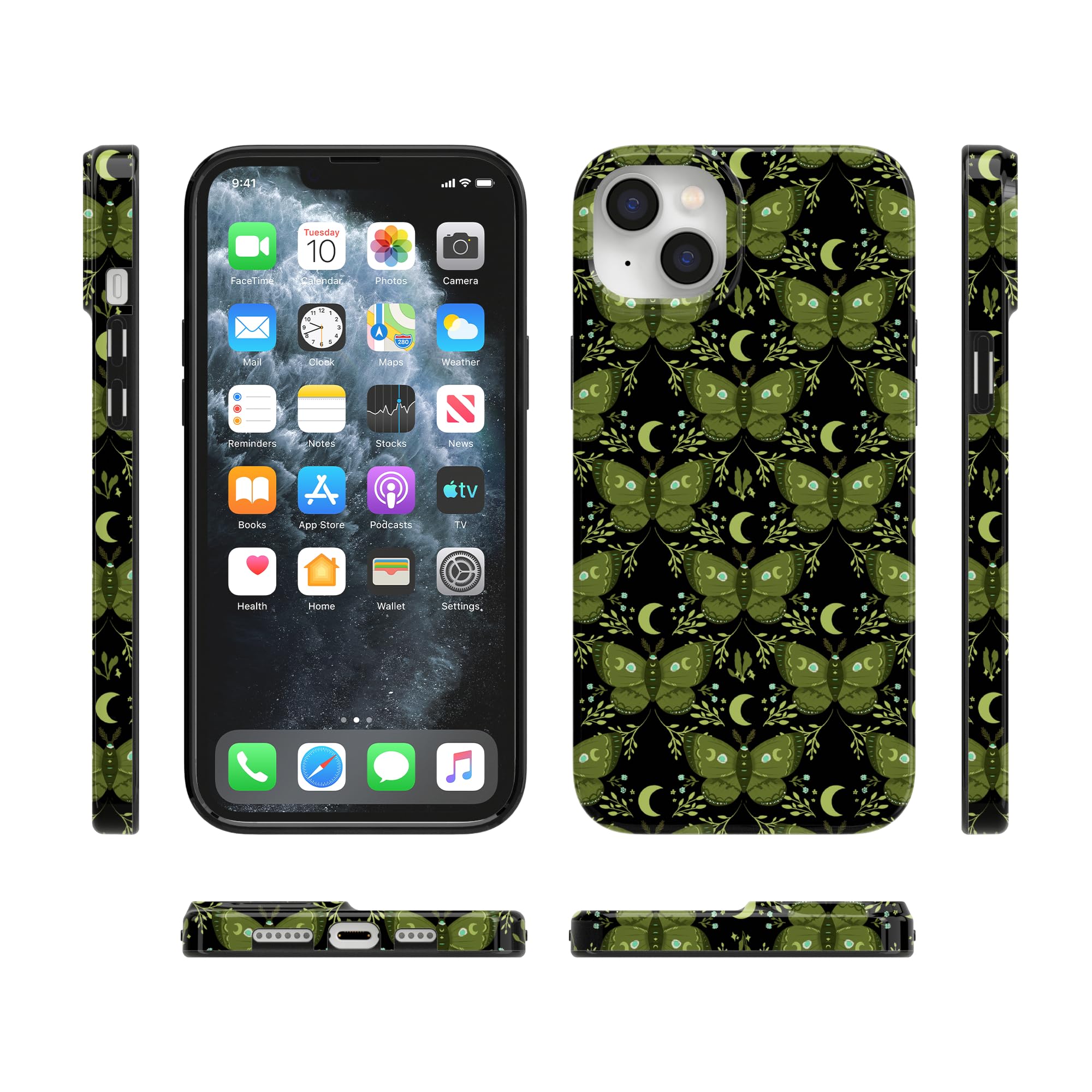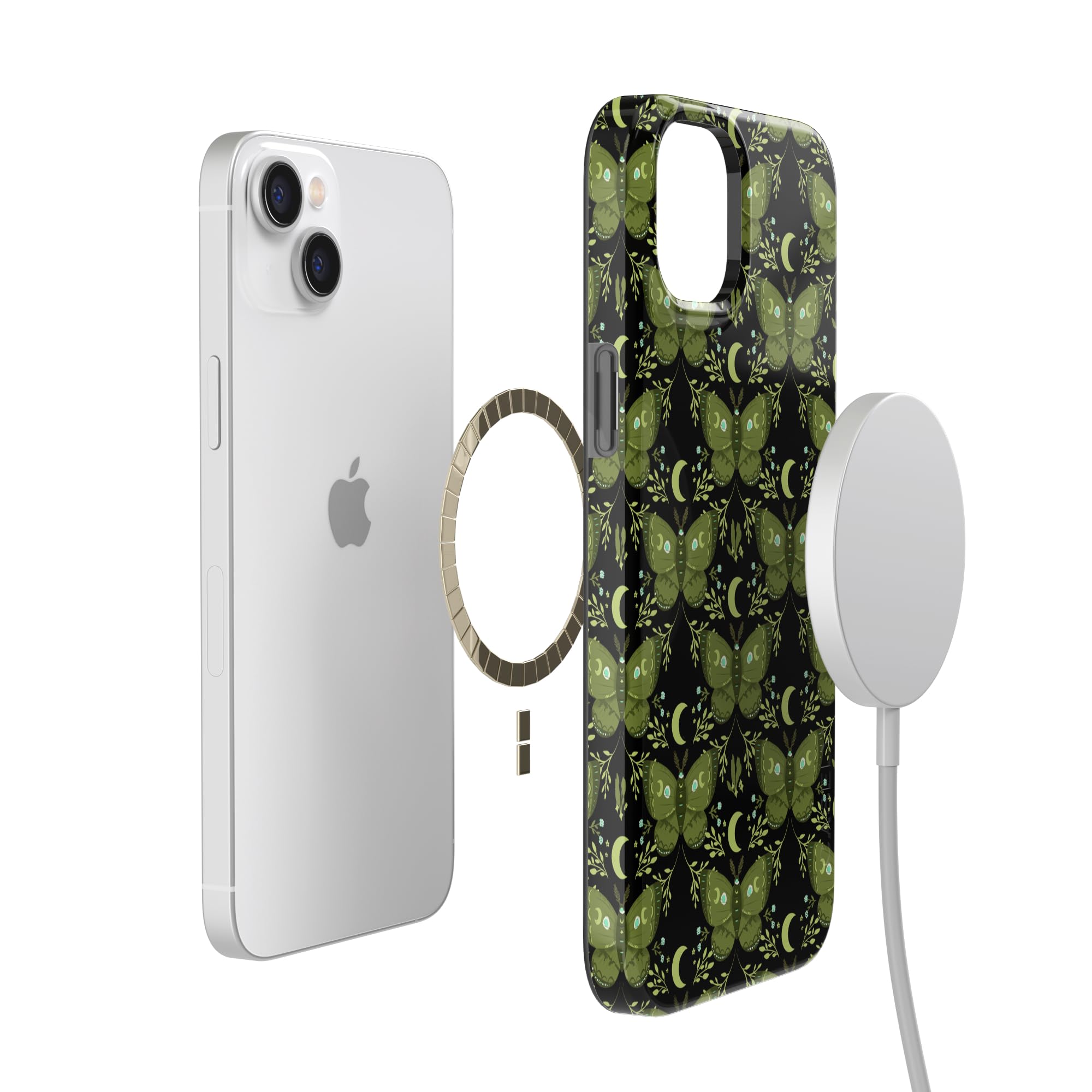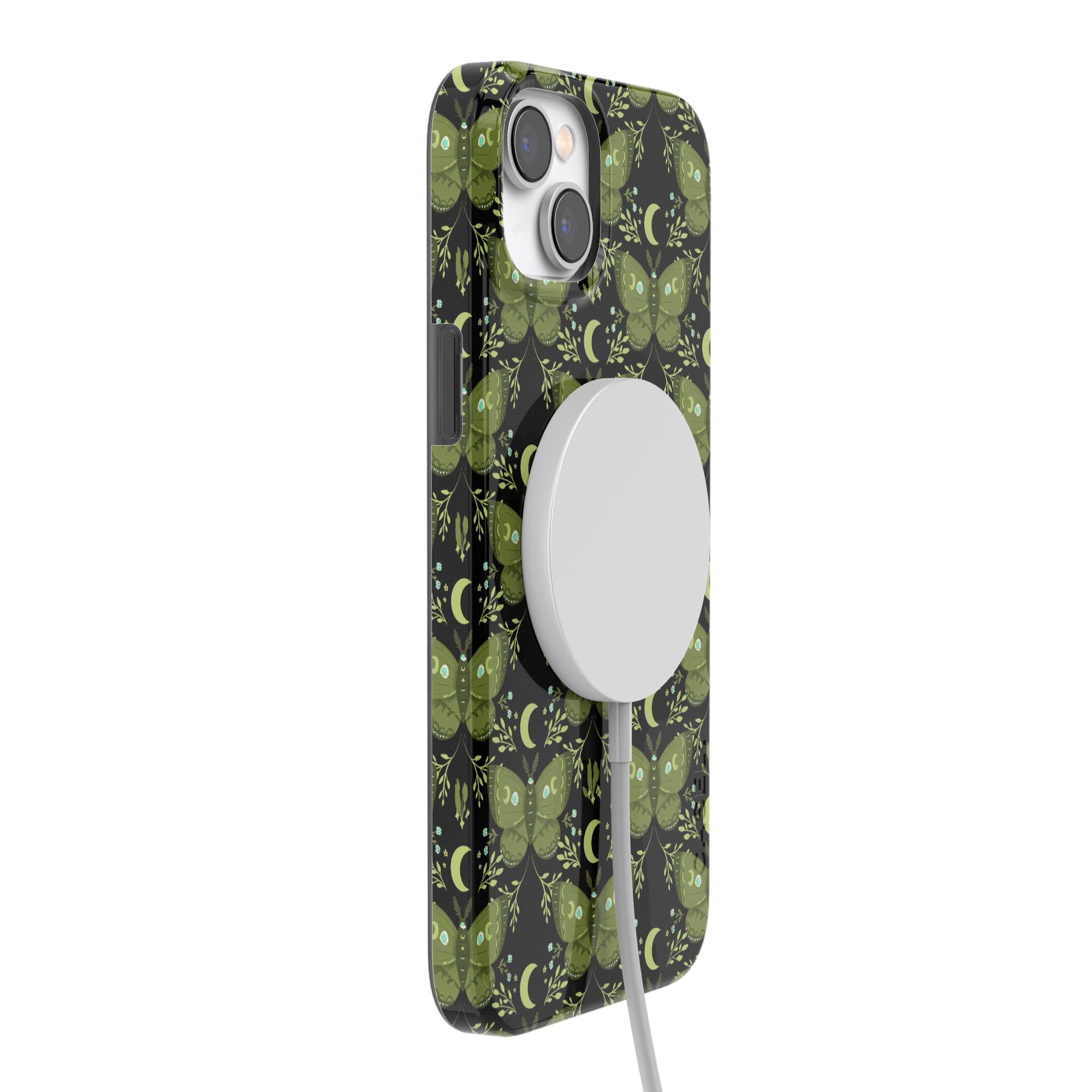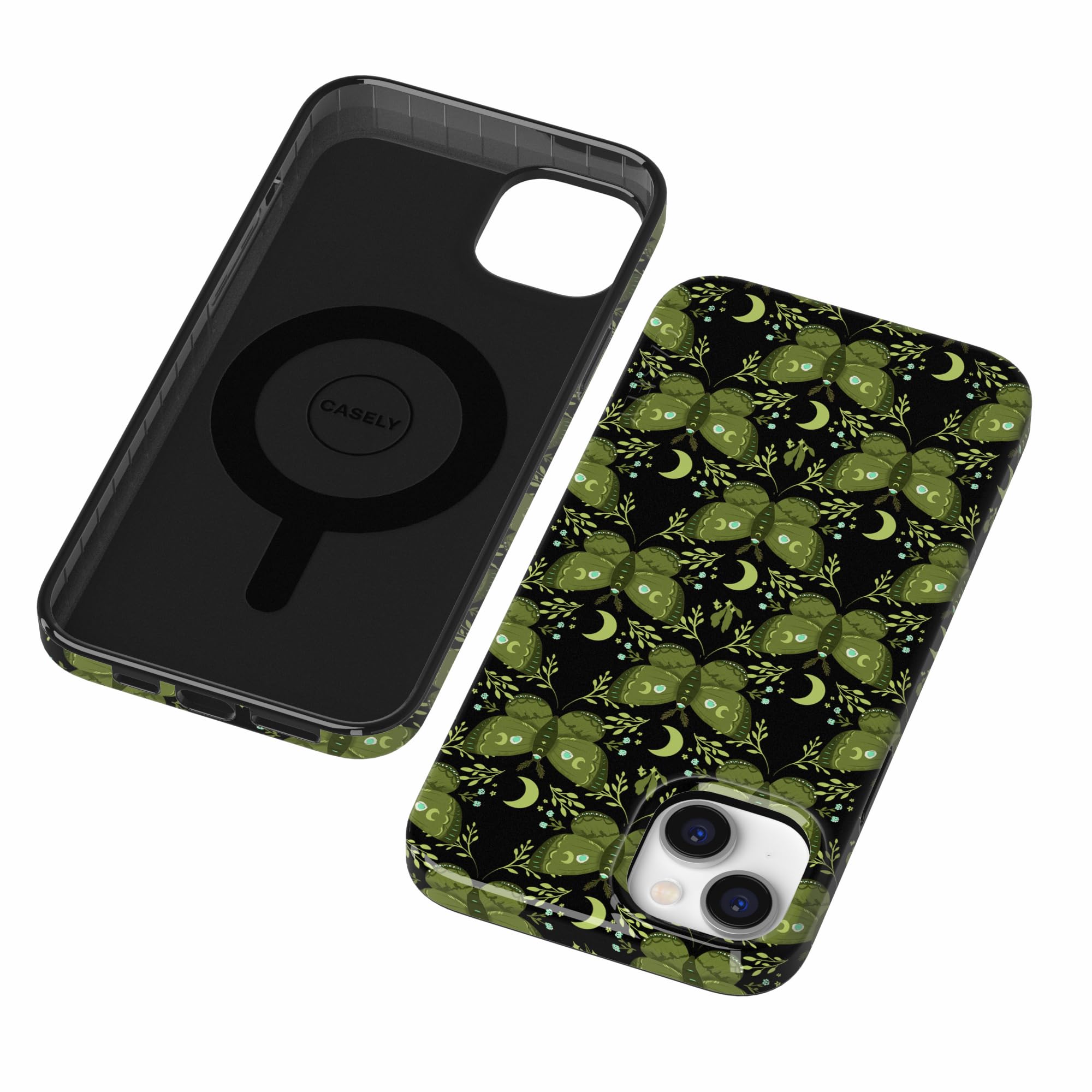 Embrace mystical nights with the Mystic Moths | Green Twilight Case. This Halloween-inspired phone case features enchanting green moths, crescent moons, and twinkling stars on a deep black backdrop—perfect for lovers of nature and magic.