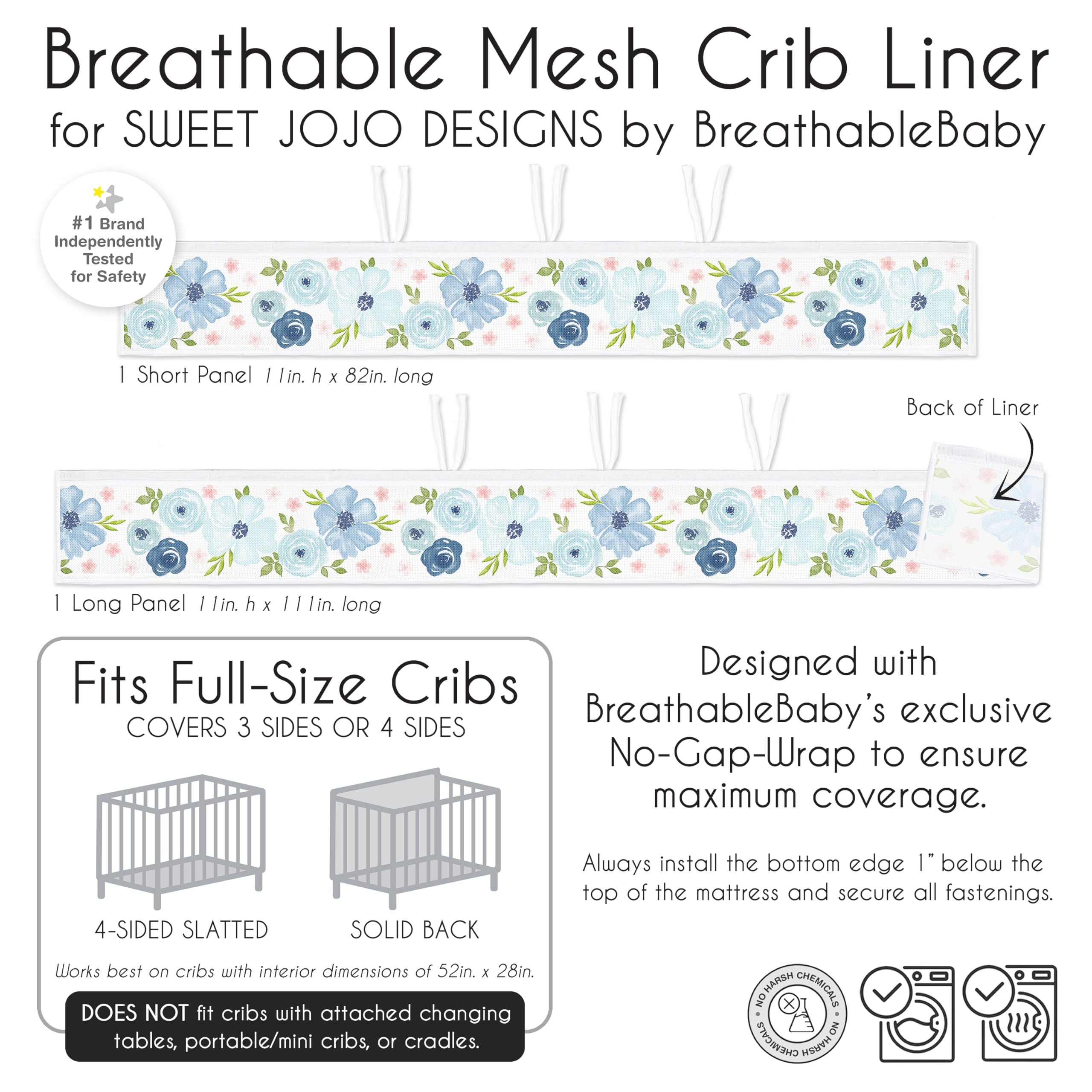 Sweet Jojo Designs + BreathableBaby Mesh Crib Liner Includes: (1) Long Panel Mesh Liner: 11in. x 111in. and (1) Short Panel Mesh Liner: 11in. x 82in. specifically designed for standard crib styles (such as solid back and 4-sided slatted style) sold in North America and incorporates BreathableBaby patented technology with our most popular designs. DOES NOT FIT and should never be used in cribs with attached changing tables, cradles, toddler beds, bassinets, portable/mini cribs or solid end cribs.