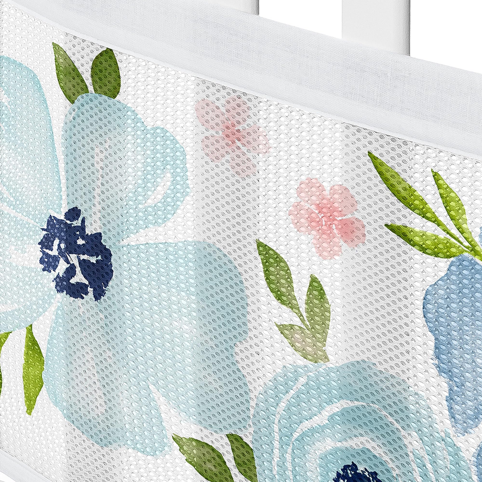 This mesh crib liner features a boho floral bohemian farmhouse shabby chic rose lily elegant flowers print with complimentary color palette from the matching Sweet Jojo Designs Navy Blue and Pink Watercolor Floral bedding collection of blush pink, grey, navy blue, gray and white.